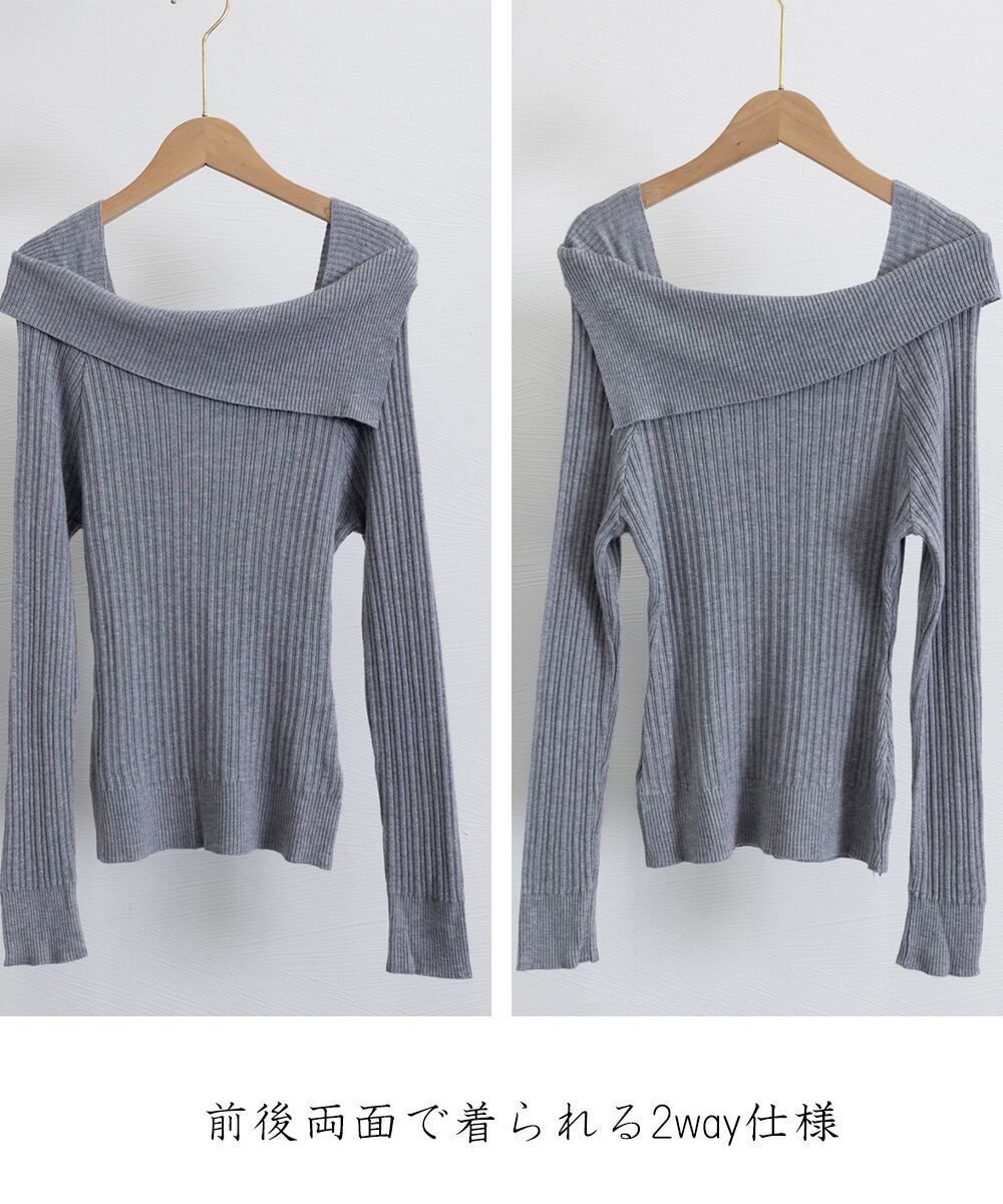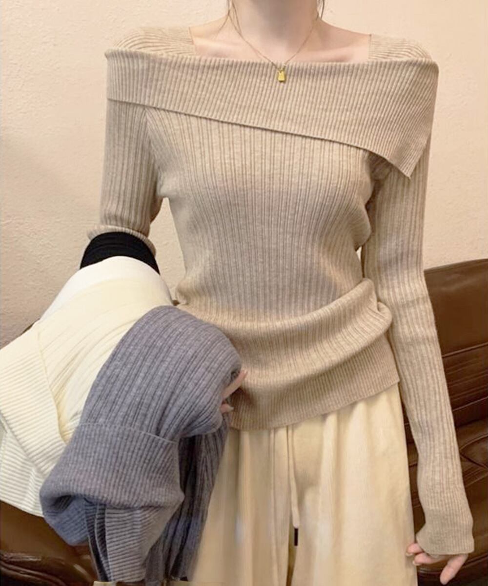 折り返しオフショルダーのデザインが首元を美しく見せ、上品な印象を与えるニットトップス