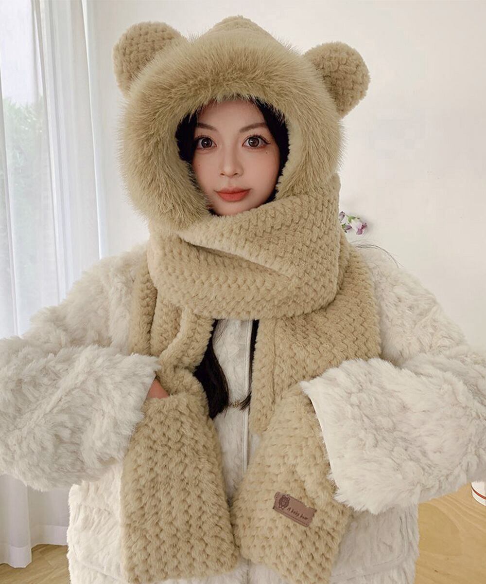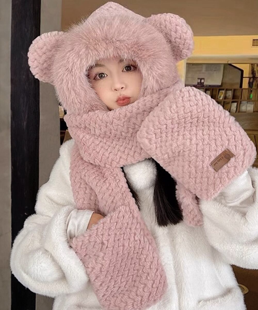 帽子、マフラー、手袋が一体型になった、可愛いクマデザインのポアニット帽です。