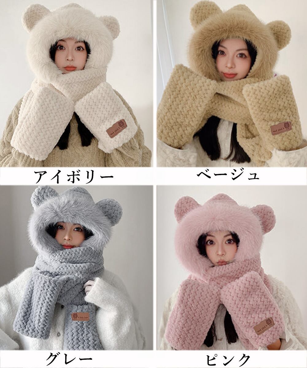 ふわふわファー帽子 あったかネックウォーマー フード付マフラー 秋冬 アニマル耳付き ぬいぐるみ帽子 アウトドア寒さ対策