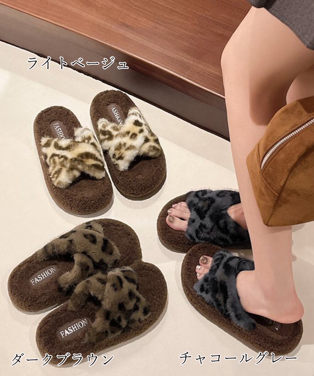 レオパードサンダルレディース もこもこあったかフラットシューズ 歩きやすい ふわふわ ルームシューズ 疲れない 寒さ対策