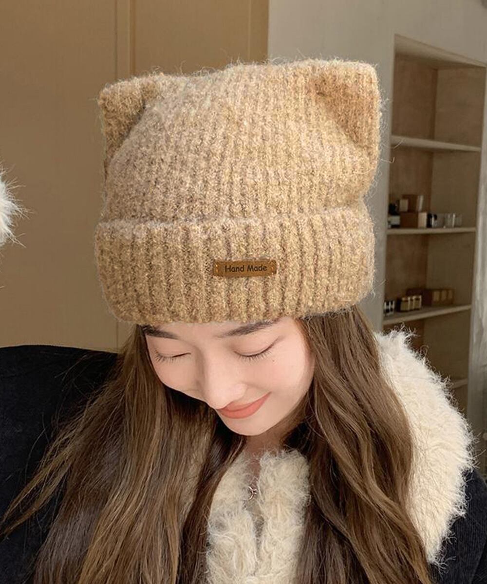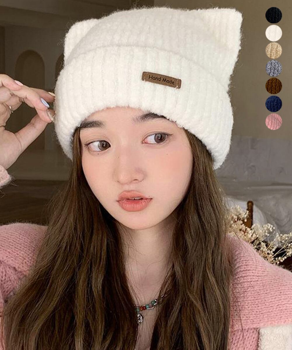 ふわふわとした肌触りの良い素材で仕上げた、可愛らしい印象の猫耳ニット帽子