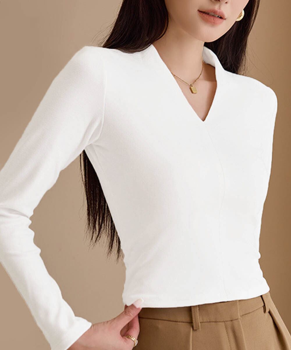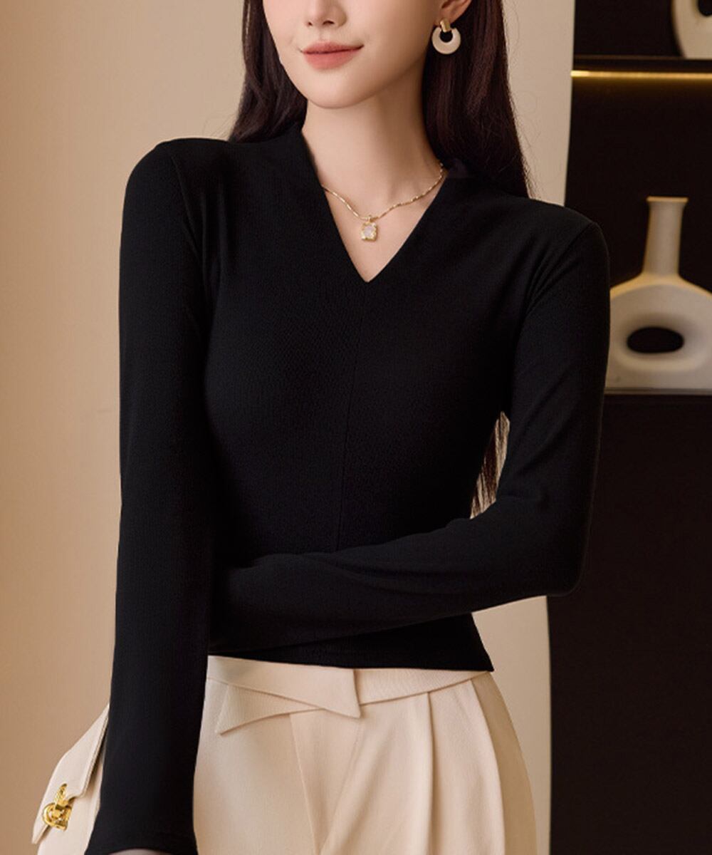 Vネックがすっきりとした印象を引き立て、女性らしさを演出するカットソートップス。