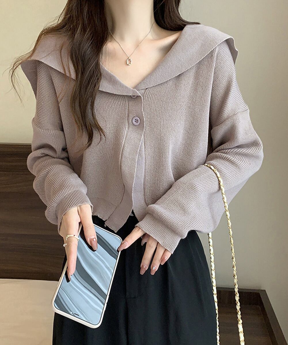 二つボタン仕様でさっと羽織れる気軽さが魅力のニットカーディガン
