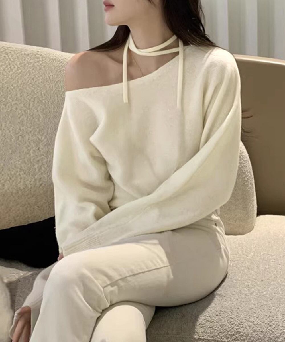 レディース 韓国ファッション セクシープルオーバー 大人可愛いニットソー お洒落 デートルック アンバランストップス長袖