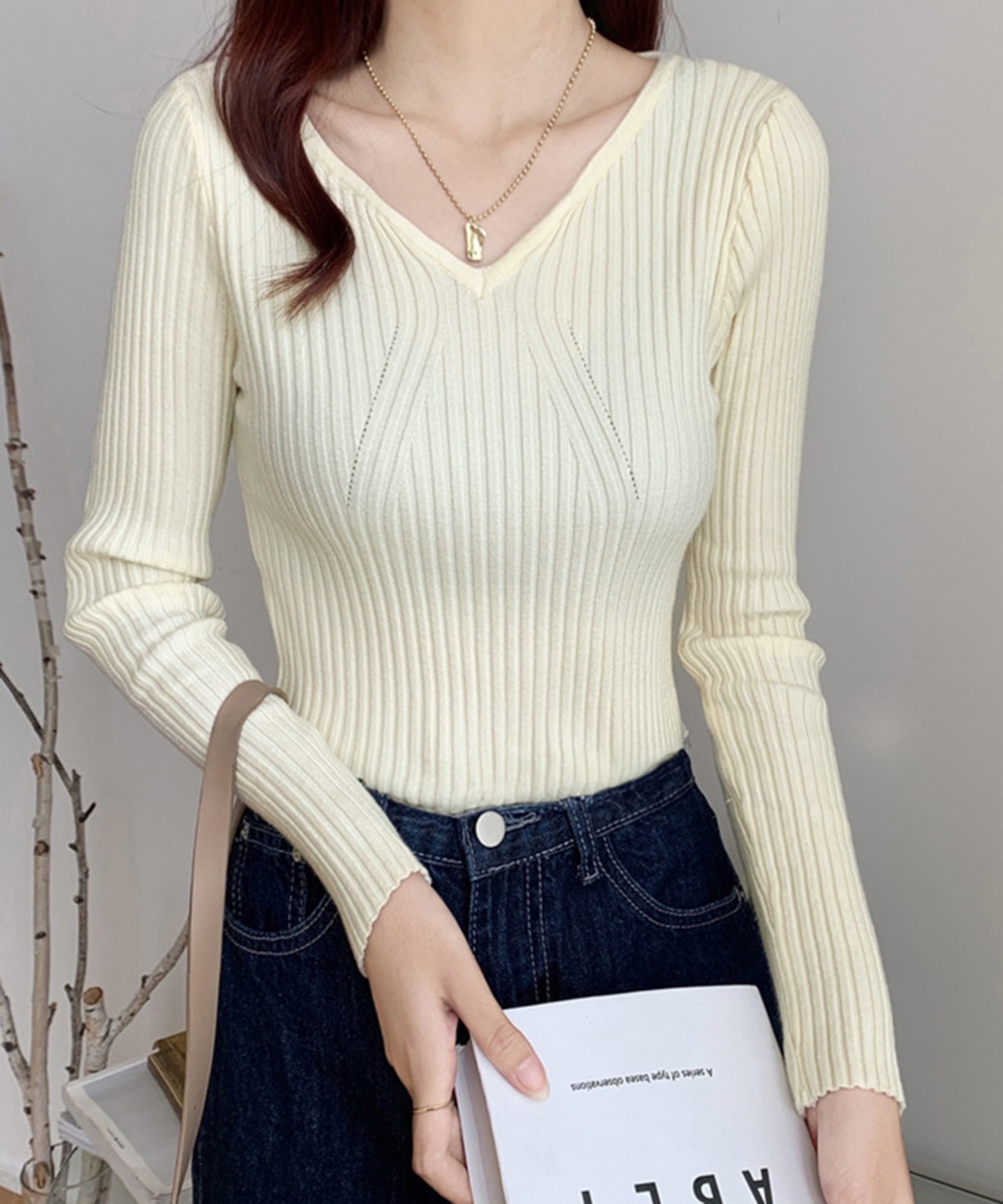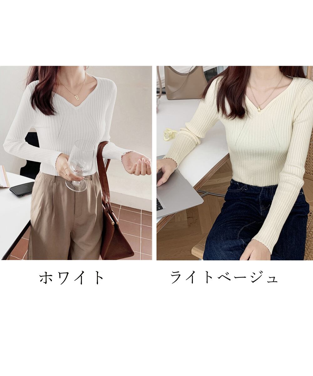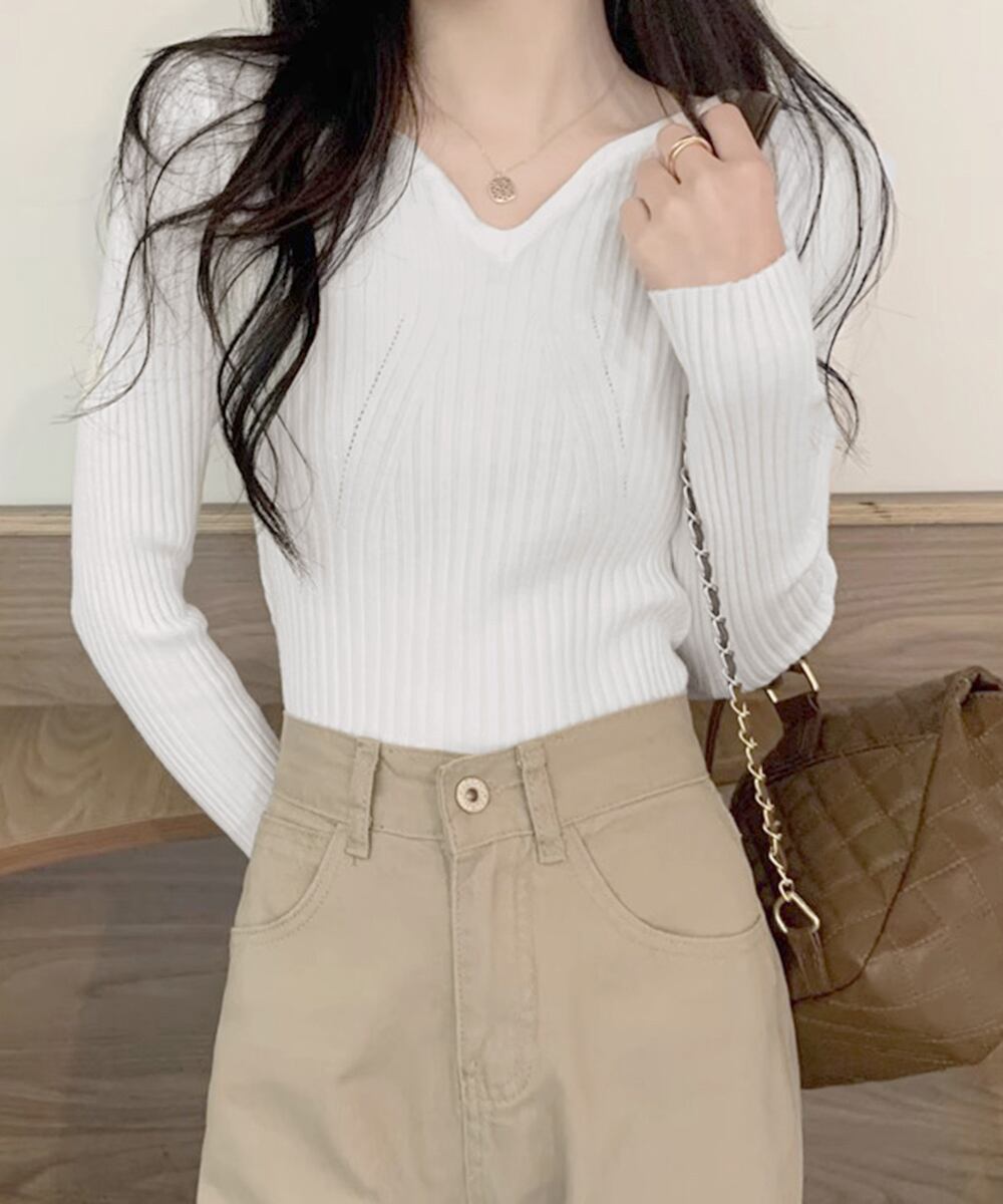シンプルで上品な印象を与えるリブ編みVネックトップス