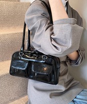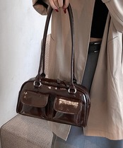 ツヤ感トートバッグ マチ広めハンドバッグ おしゃれ マルチポケット 学生カバン 韓国風通勤通学 PUレザーバッグ 高級感
