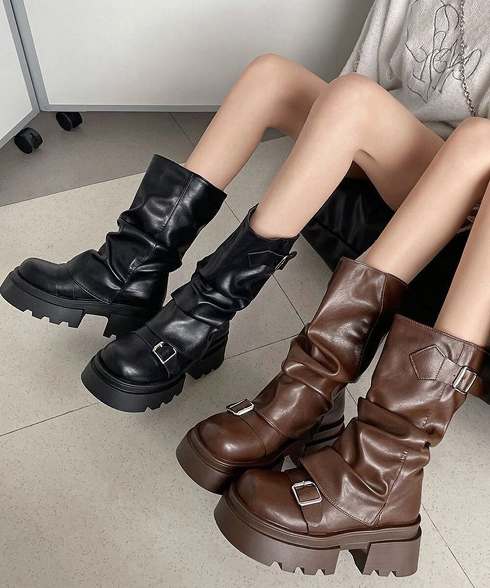 ルーズな履き口デザインがカジュアルでありながら、こなれ感のある印象を演出するベルト付き厚底カバーブーツ。