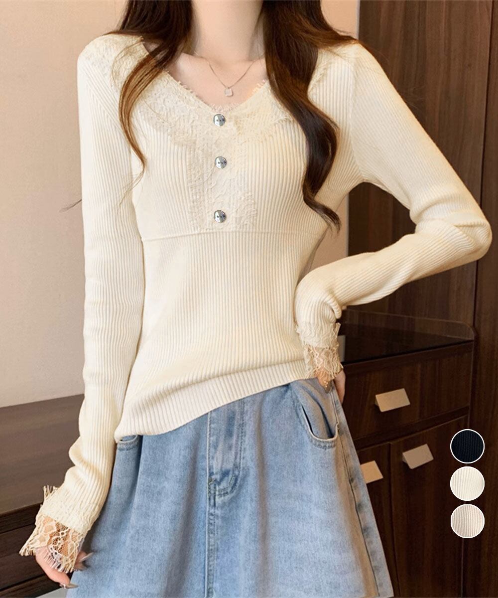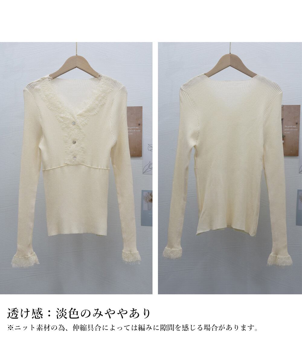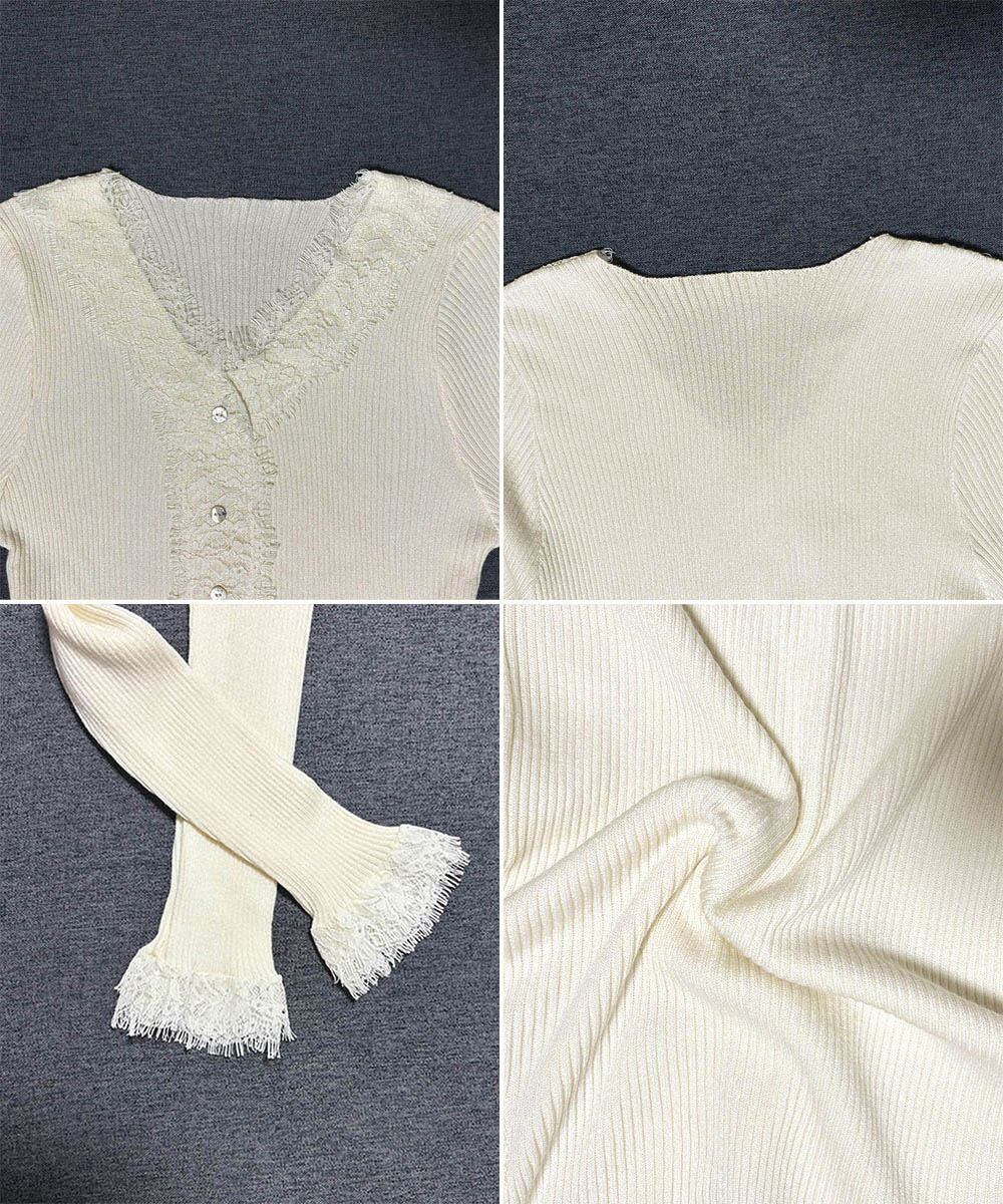 レース切り替えデザインが胸元と袖口を美しく引き立て、上品さと華やかさを演出