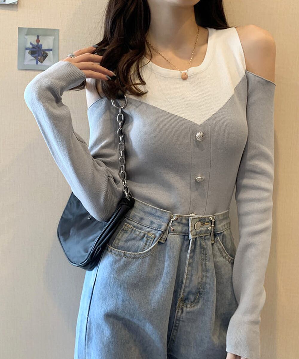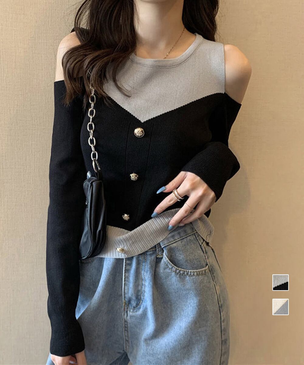 トレンド感あふれる肩出しデザインとバイカラーがポイントのニットトップスです。