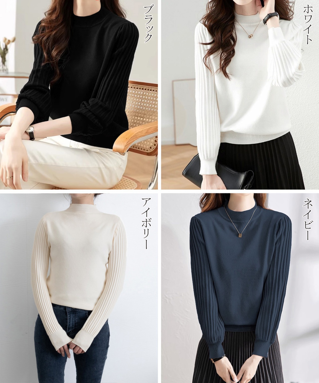 プチハイネック 長袖 ニットセーター プリーツ袖 オフィスカジュアル ニットウエア 無地 ニットインナー大人