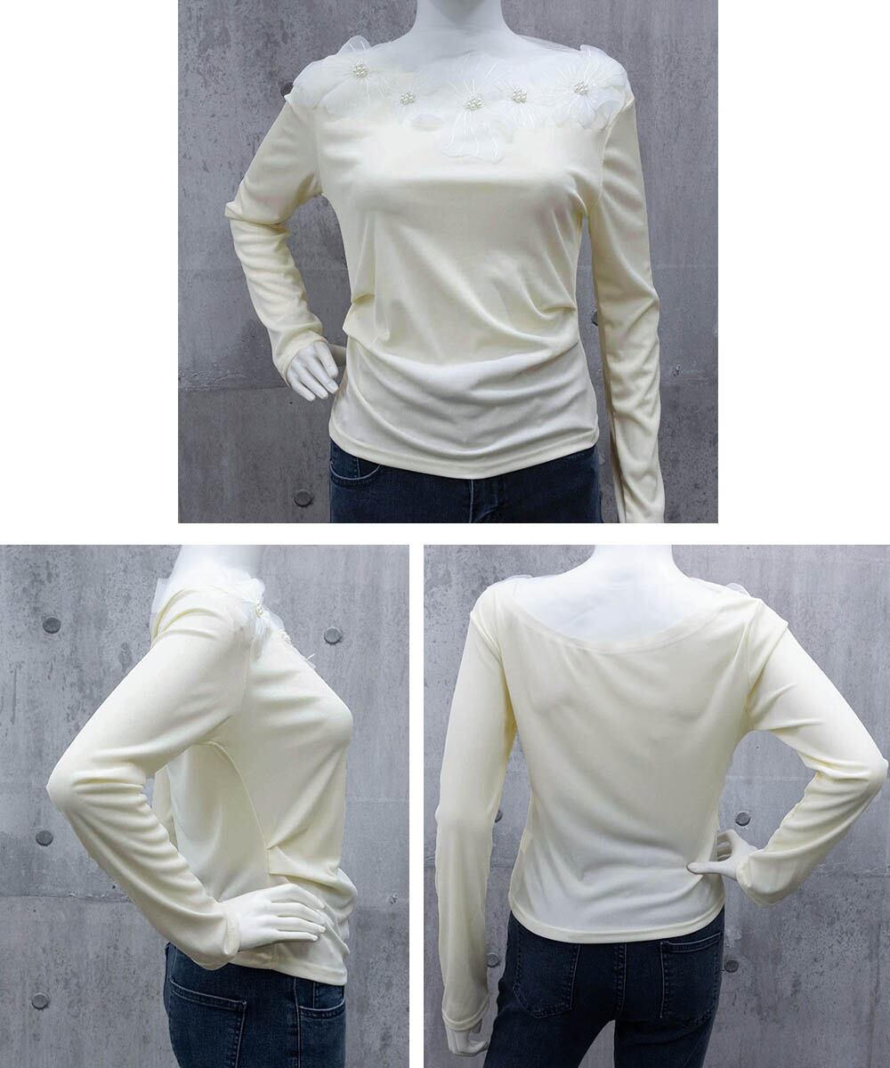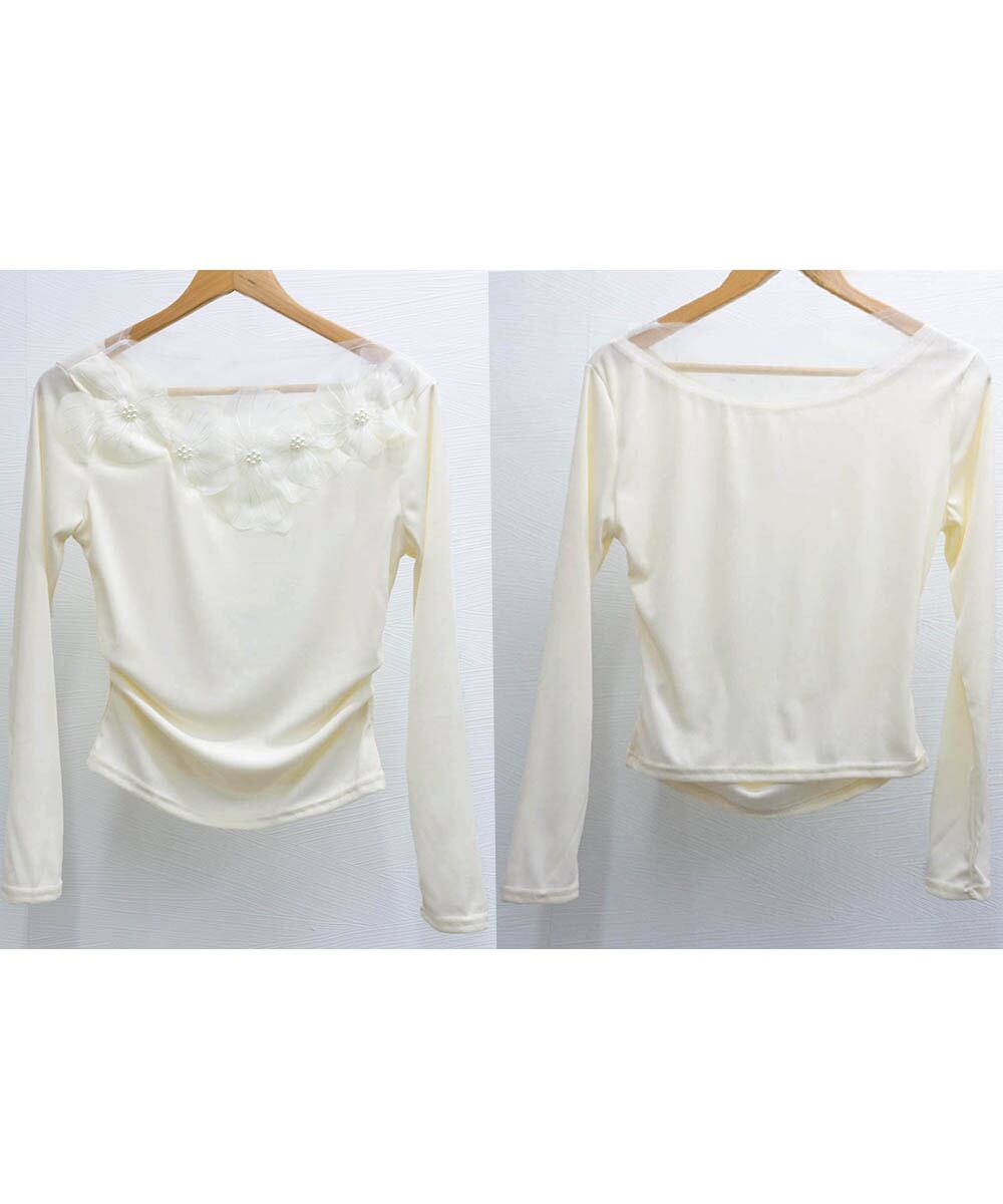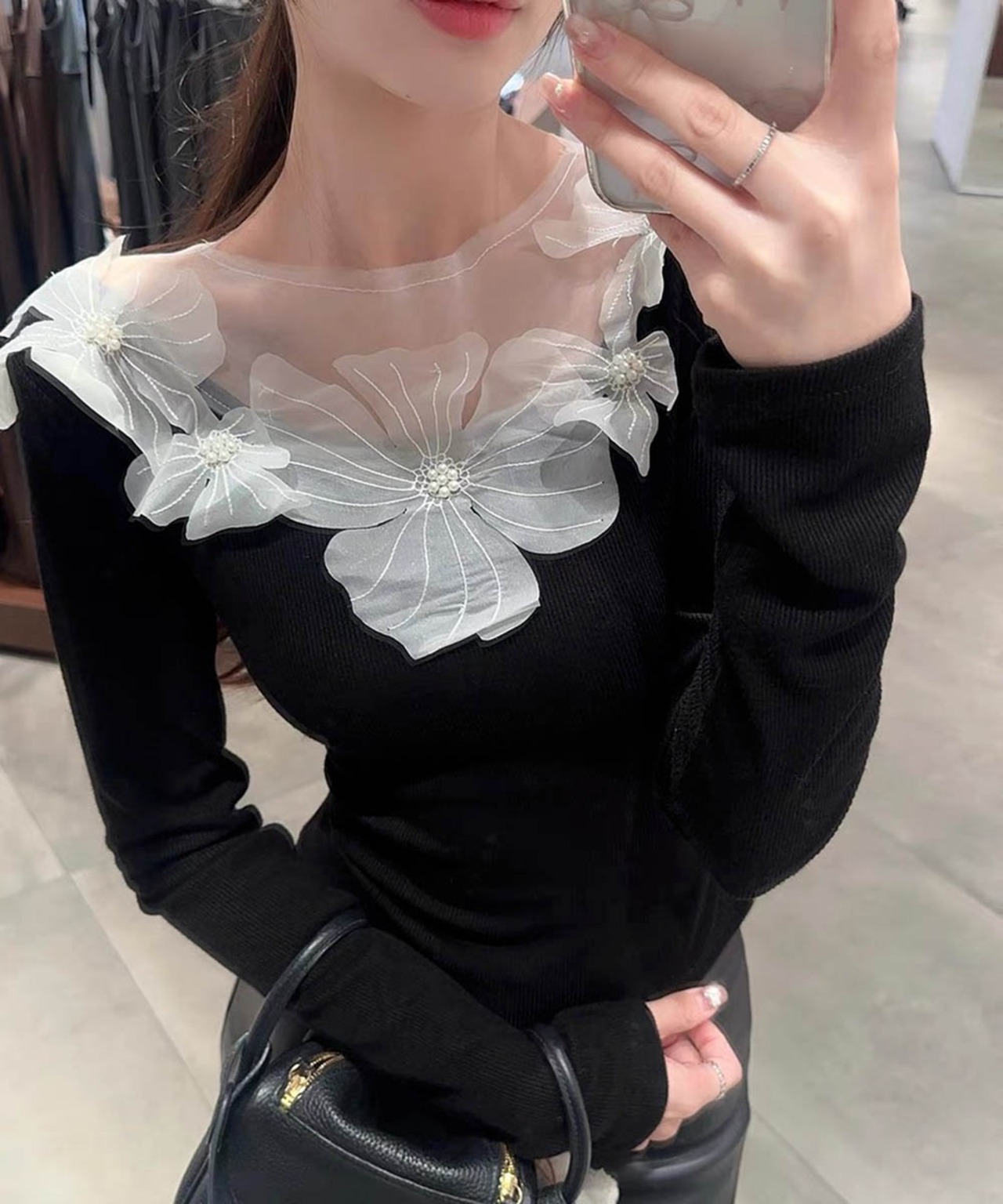 レディース チュール フラワー 着やせプルオーバー トップス  長袖 きれいめ 着回し シアー花柄 人気 お出かけ