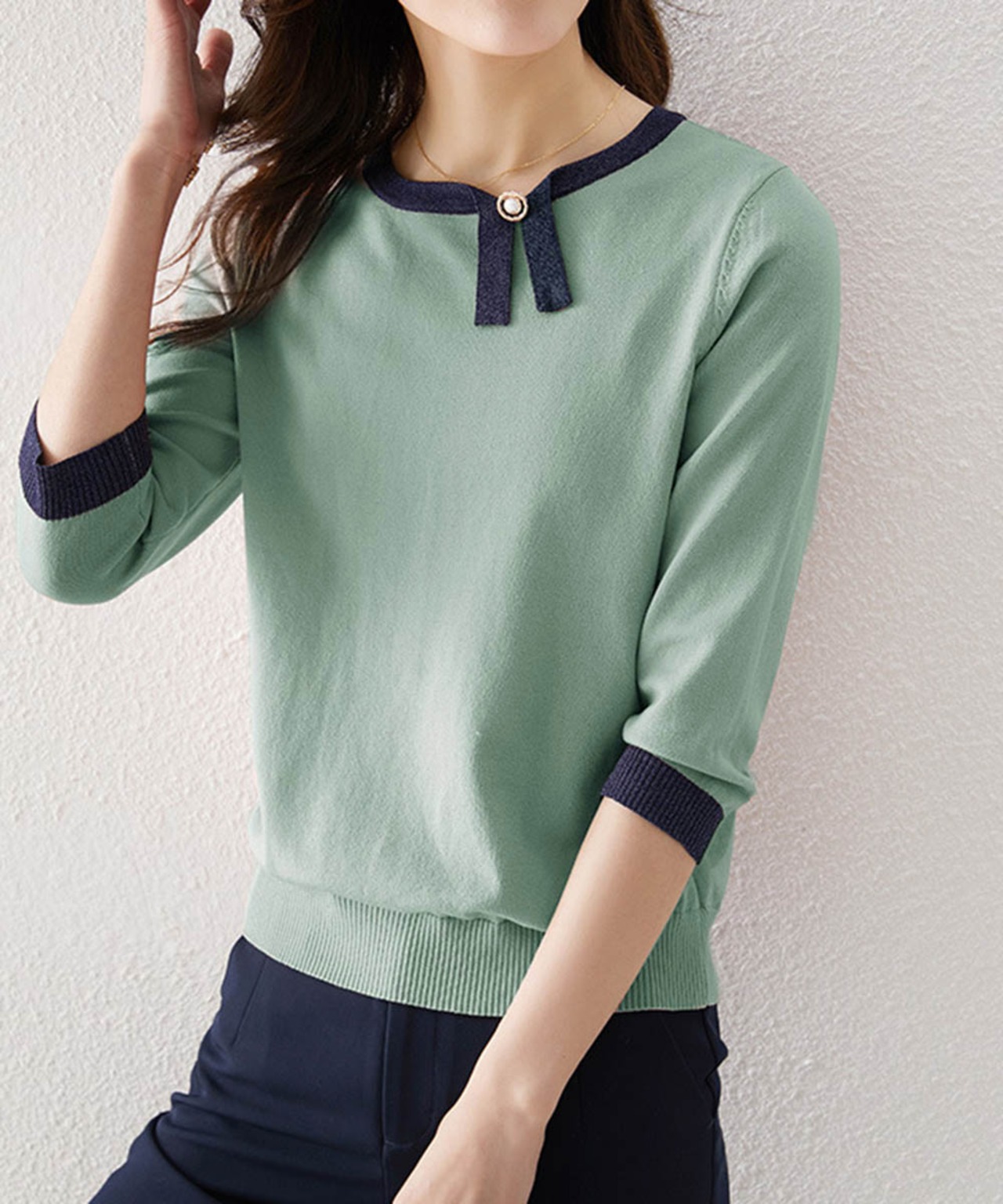 大人の垢抜けた雰囲気を演出する七分袖ニットトップスです。