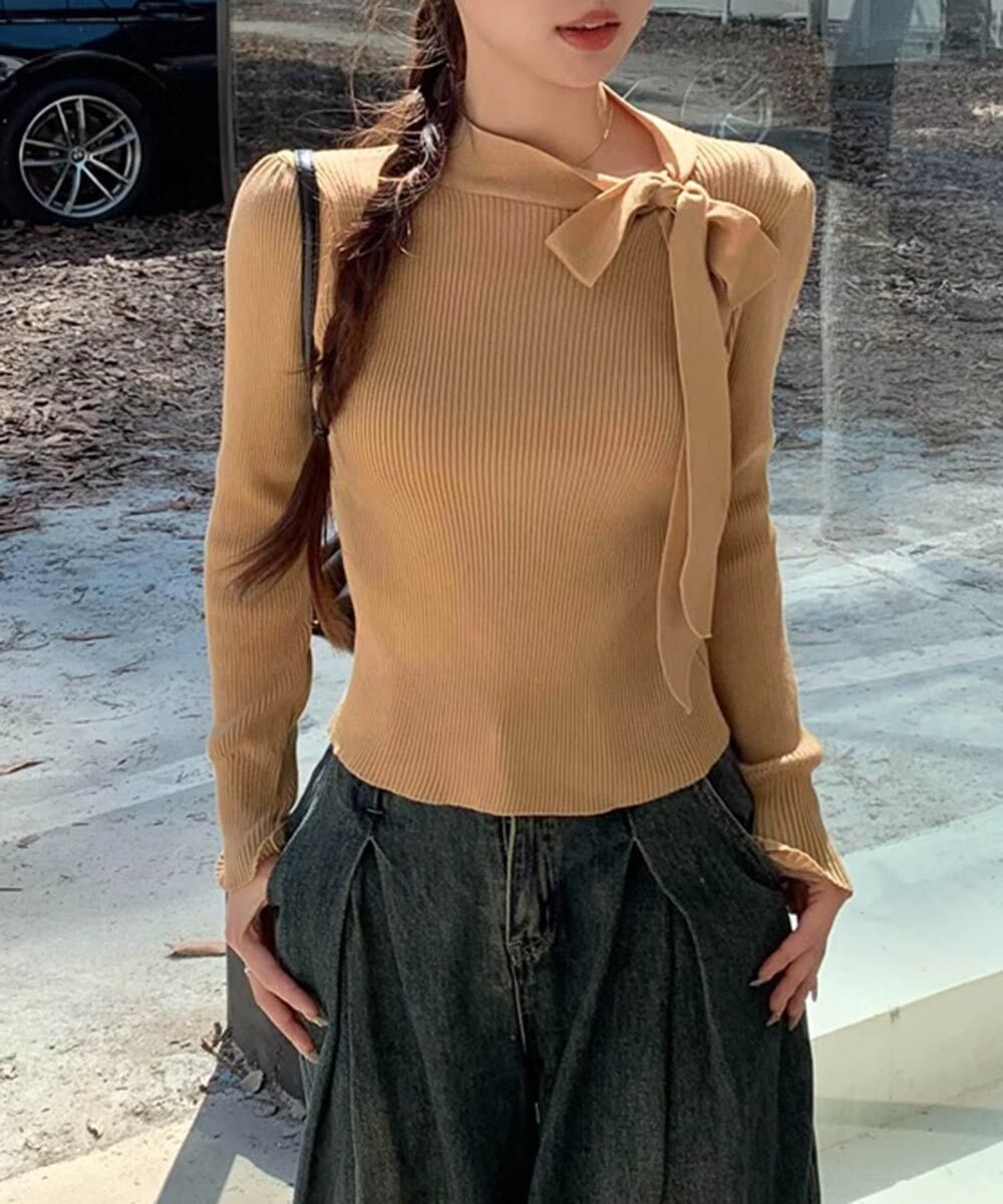 ネックラインのリボンデザインがアクセントになり、エレガントな印象を与えるアイテムです。