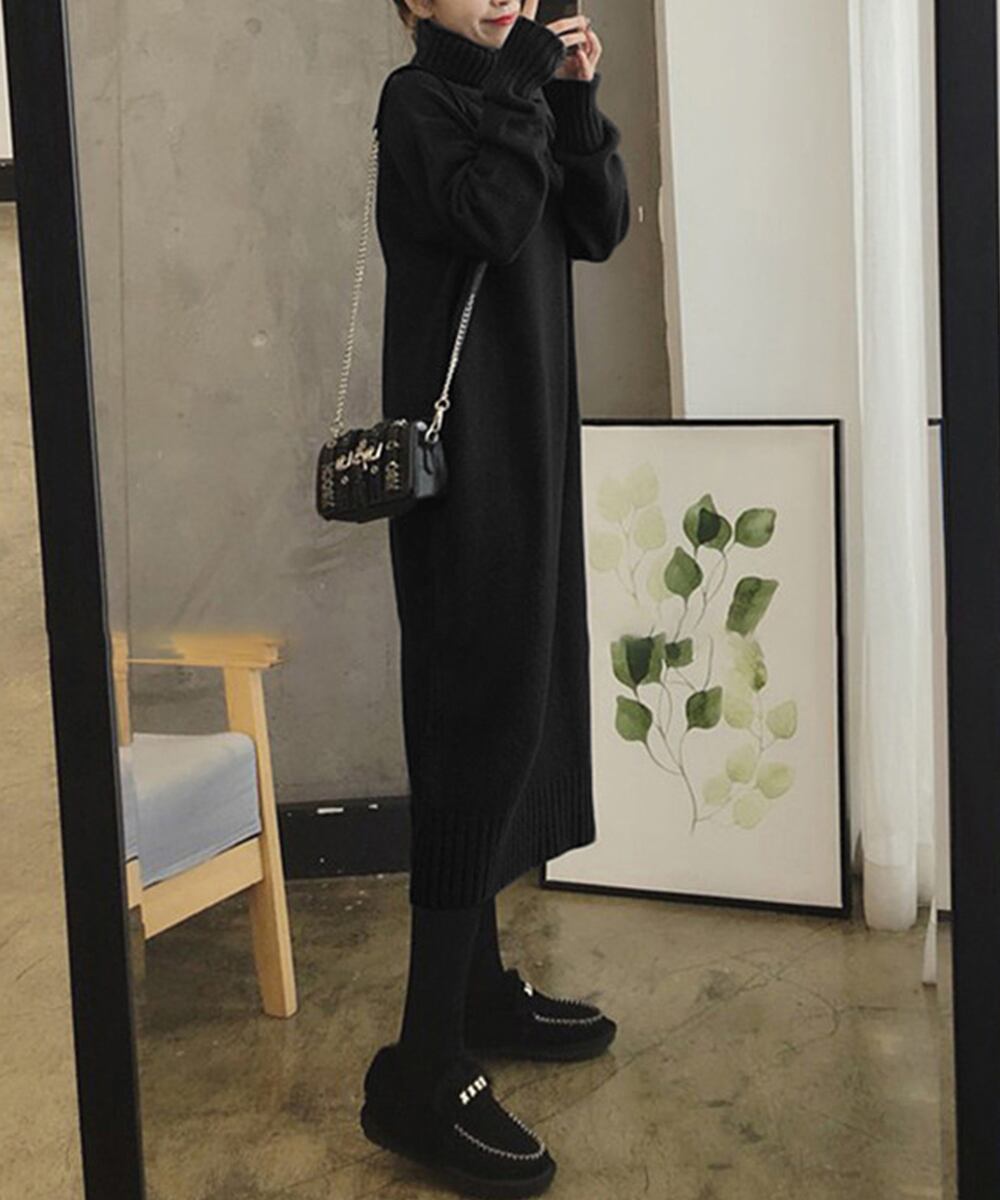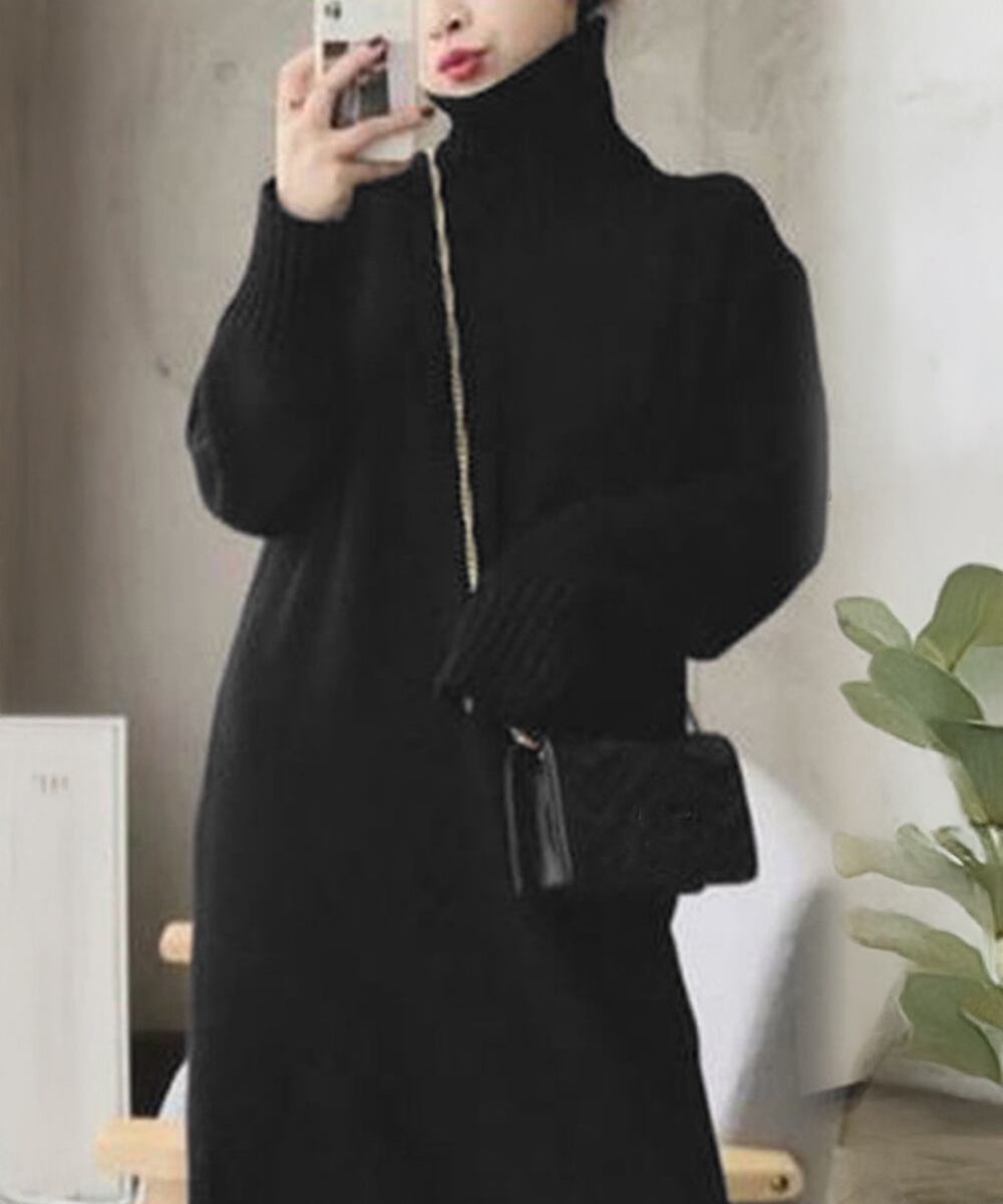 顔周りを印象的に魅せるタートルネックで、首元までしっかり暖かいロング丈ニットワンピース。