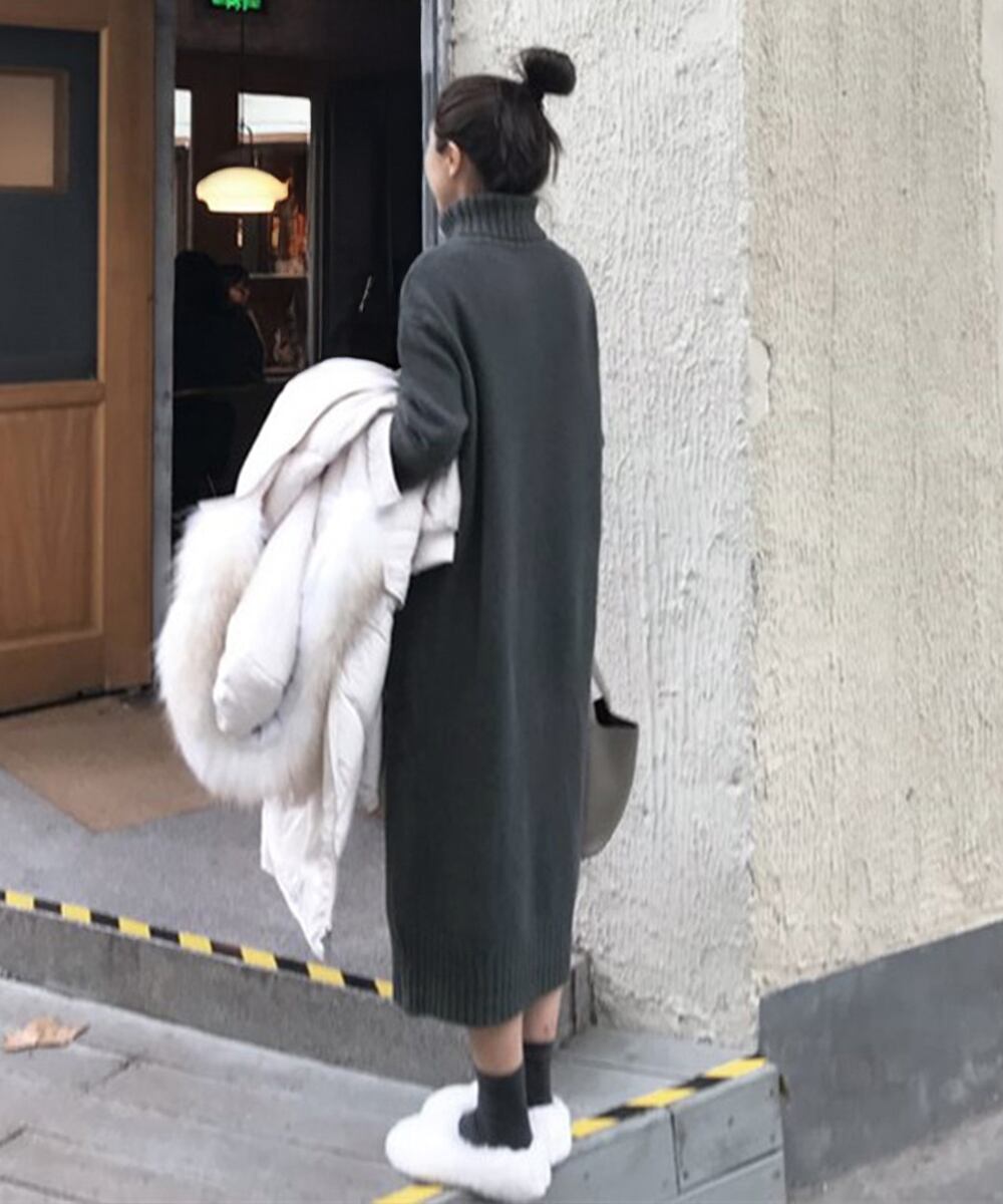 韓国風ワンピ細見え お洒落ワンピ着やせ 体型カバー ニット