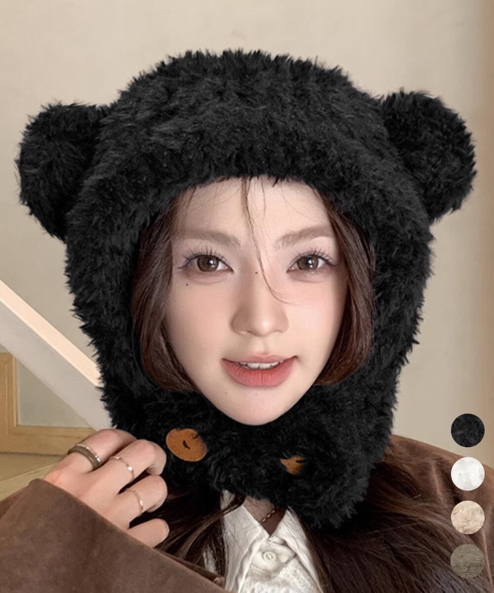 ふわふわの厚手ボア素材で仕上げたクマ耳デザインのレディース帽子。