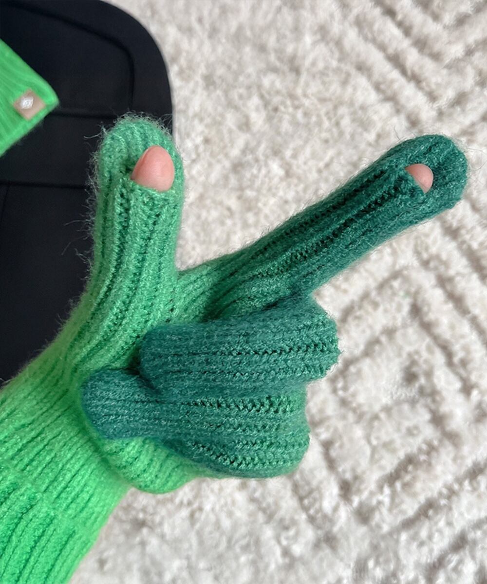 高発色のレインボーカラーグラデーションが目を引くレディースニット手袋。