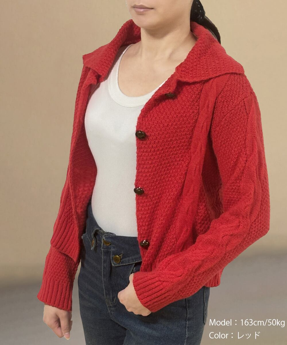 ざっくりとしたケーブル編みと立体感のあるビッグカラーが華やかさを添えるショート丈ニットカーディガン。