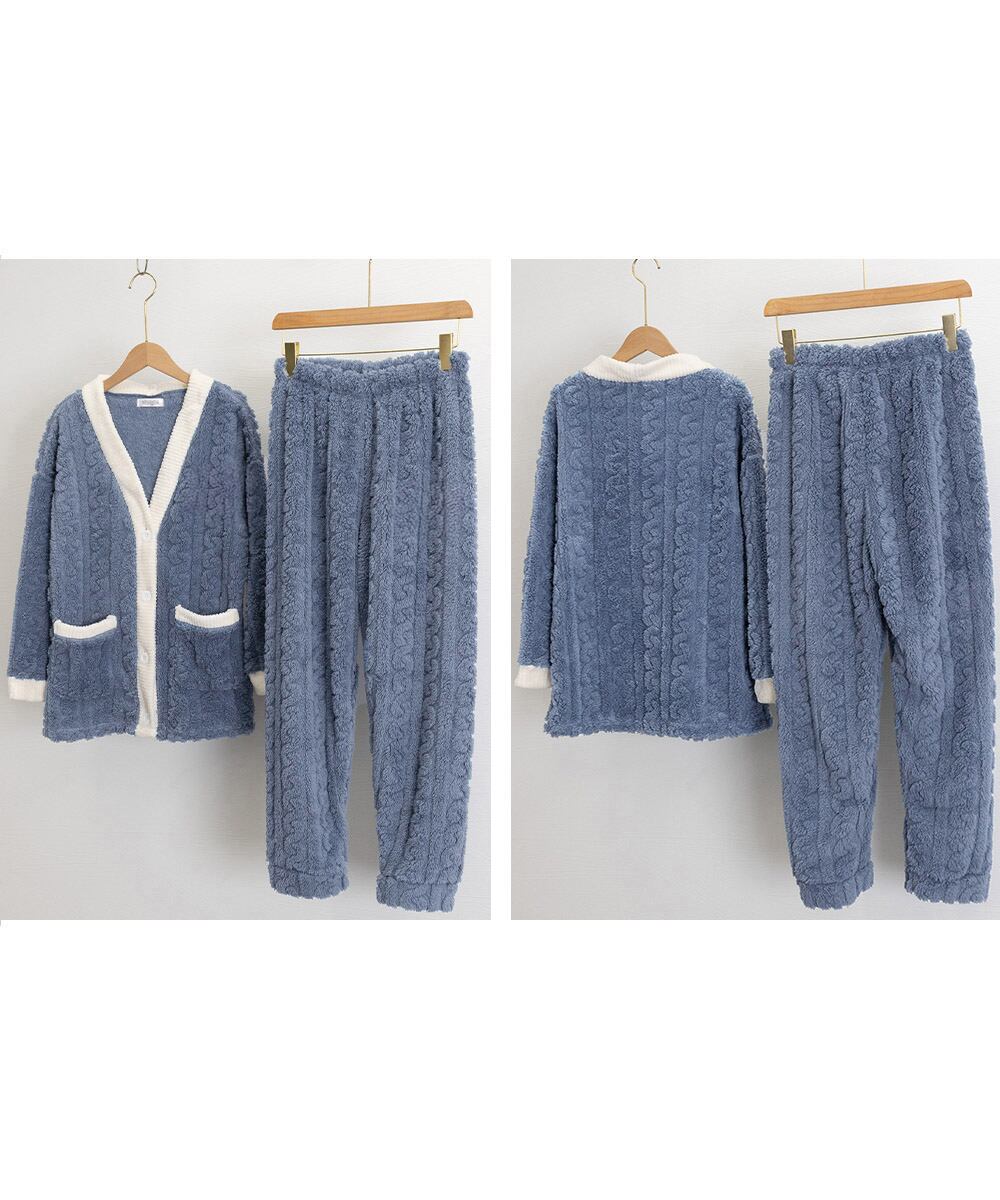 レディース ケーブル柄 部屋着セットアップ ふわふわナイトウェア 軽く暖かい 厚手保暖着る毛布 Vネックパジャマ 防寒