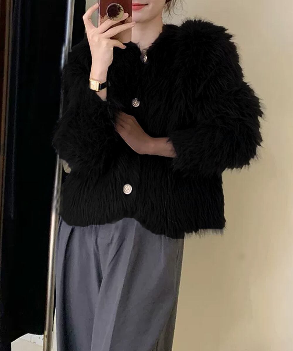ファージャケット秋 ショート丈カーディ 大人上品トップス黒