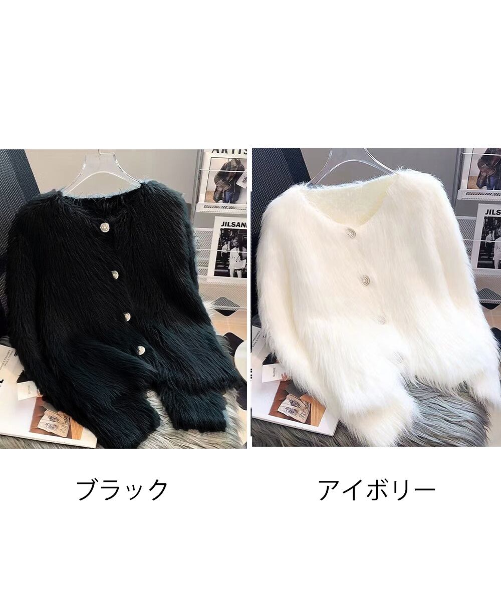 レディース 大人可愛い フェザーヤーンカーディガン フェイクファーニットジャケットきれいめニット羽織 長袖ライトアウター