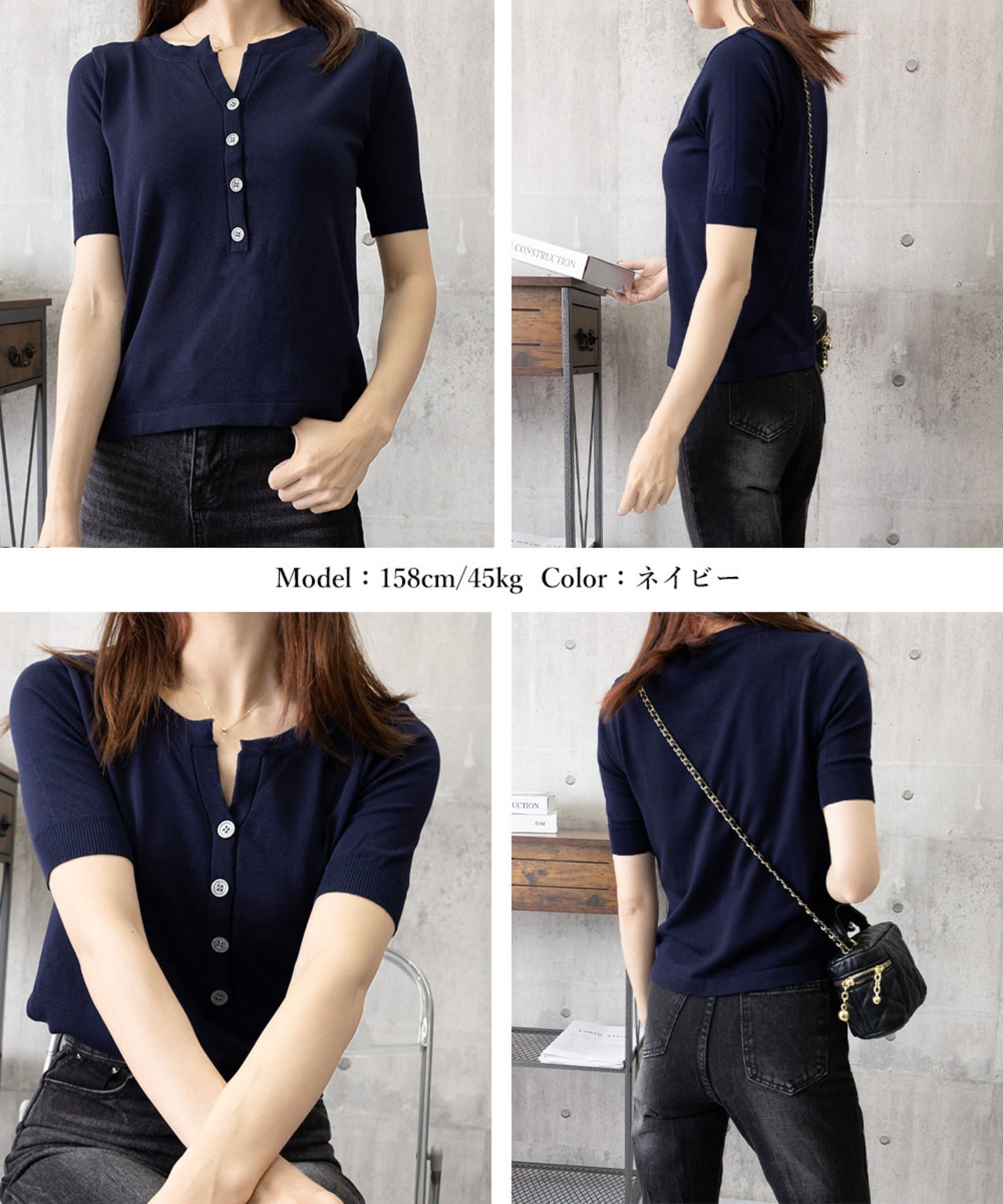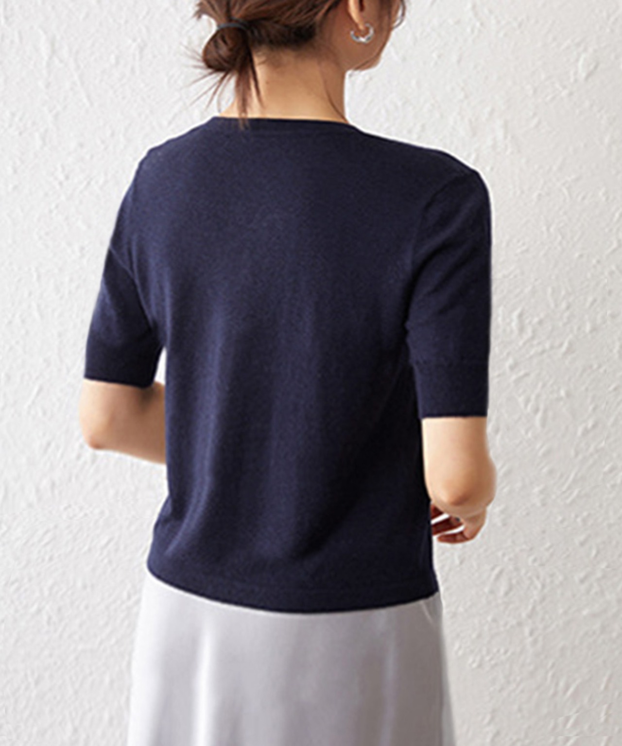 柔らかなサマーニット素材で着心地が良く、シンプルながらも上品な印象を演出する。