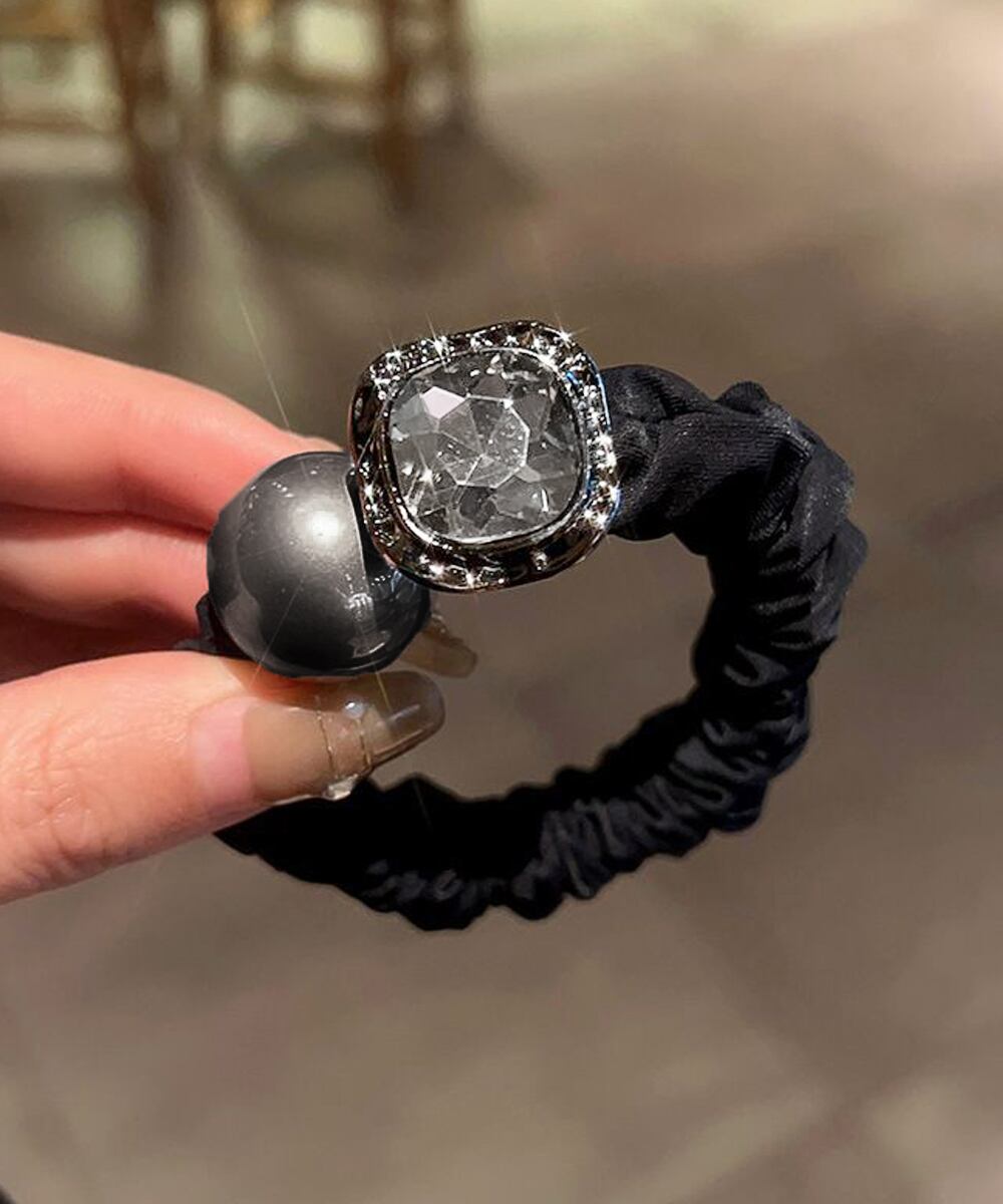 大粒のフェイクパールと輝くビジューが目を惹く華やかなヘアゴム。