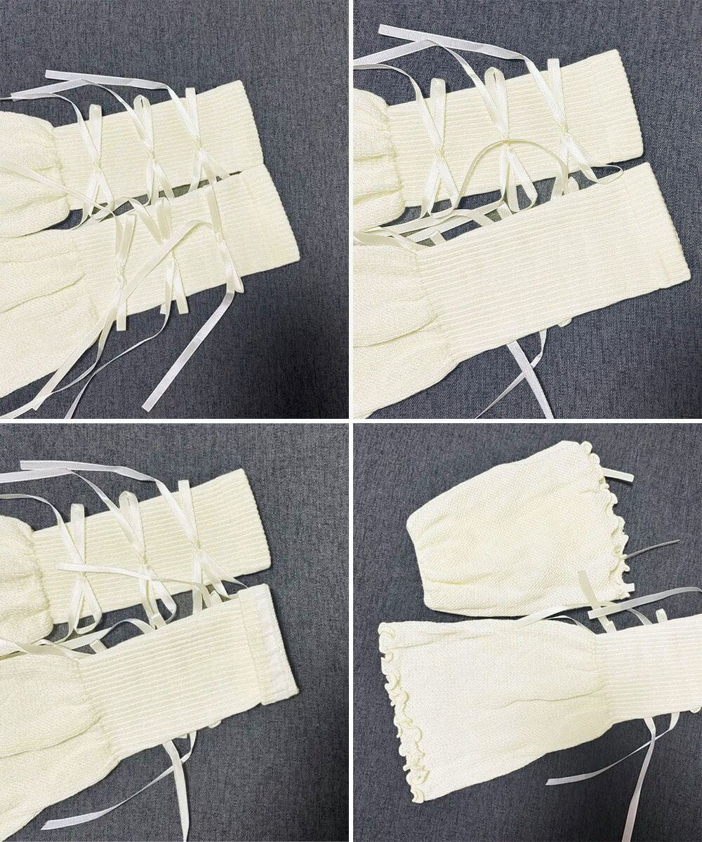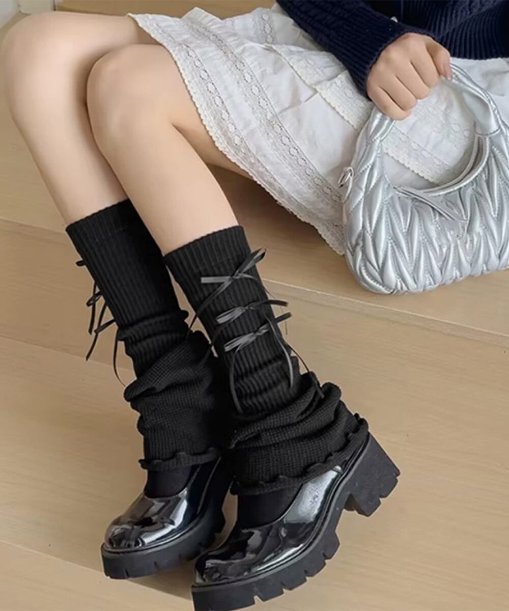 リボン付きの裾フレアデザインが可愛らしいレッグウォーマー。