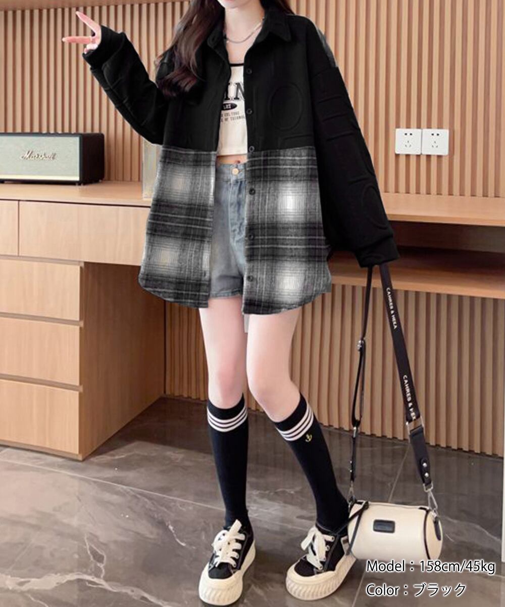 チェック柄の切り替えがアクセントになった、型押し加工のスウェット風オーバーサイズシャツジャケット。