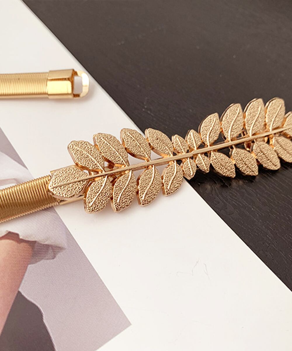 ウエストベルト レディース フィット 金属製ベルト 葉っぱモチーフ ウエストマーク 細見え ゴールドチェーンベルト 上品