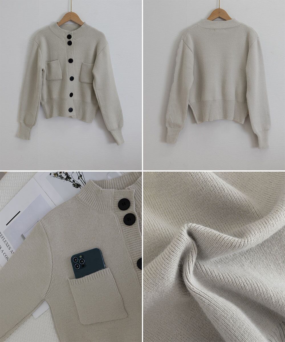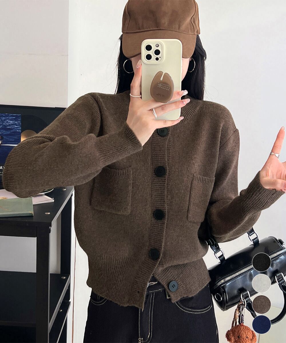 シンプルで着回しやすいフロントポケット付きニットカーディガン。