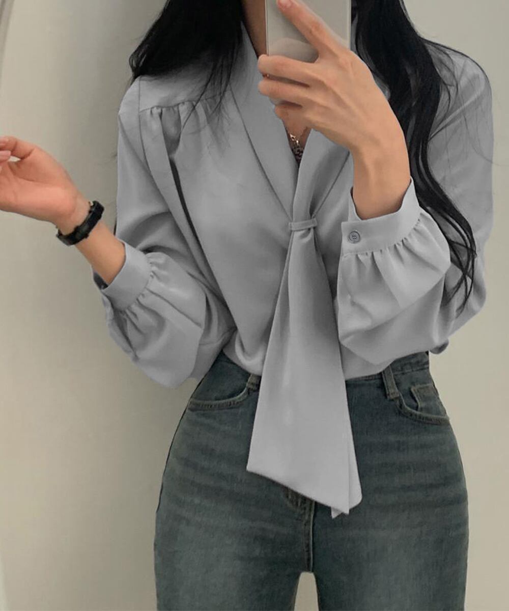 無駄のないシンプルなタイネックブラウス。