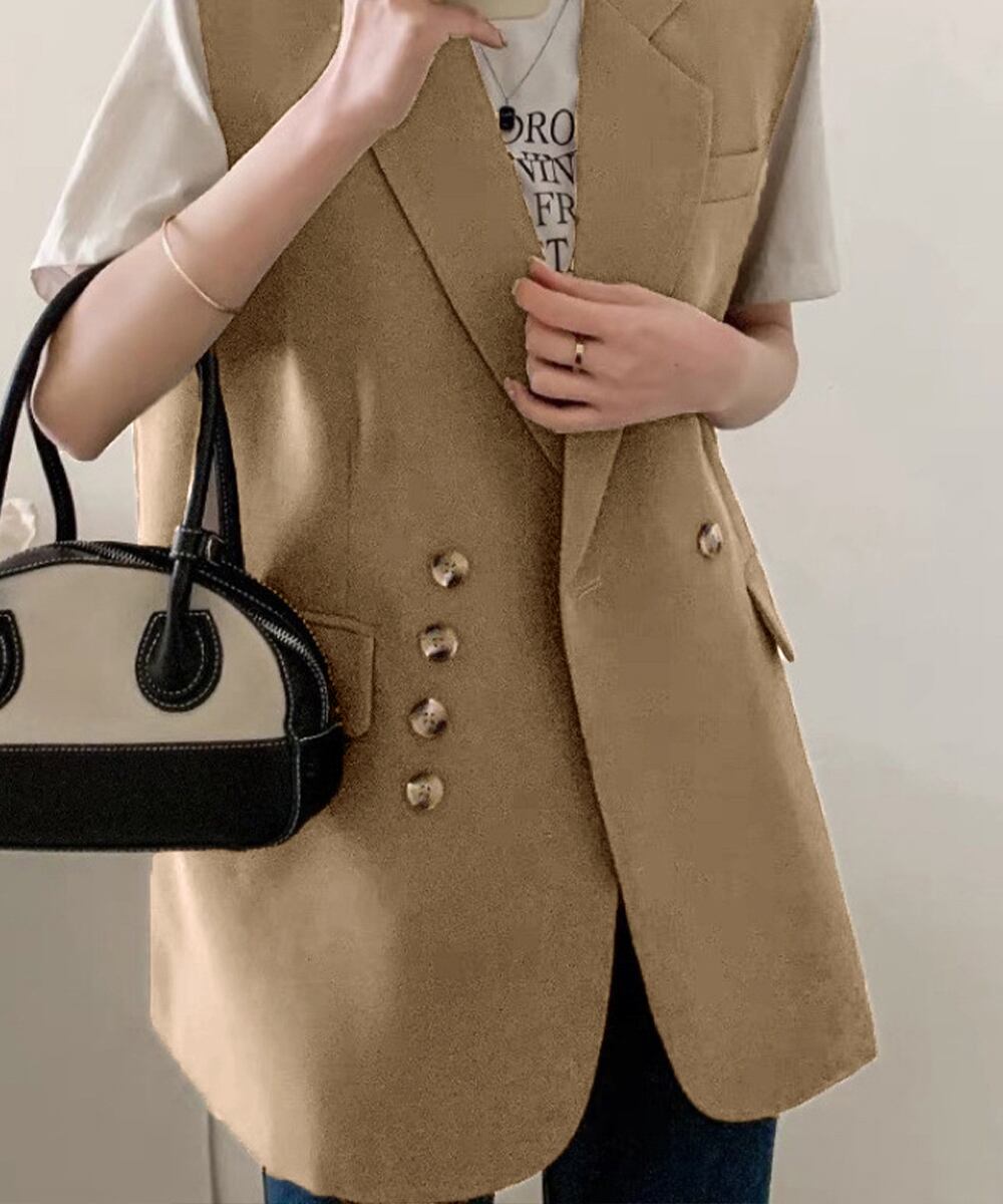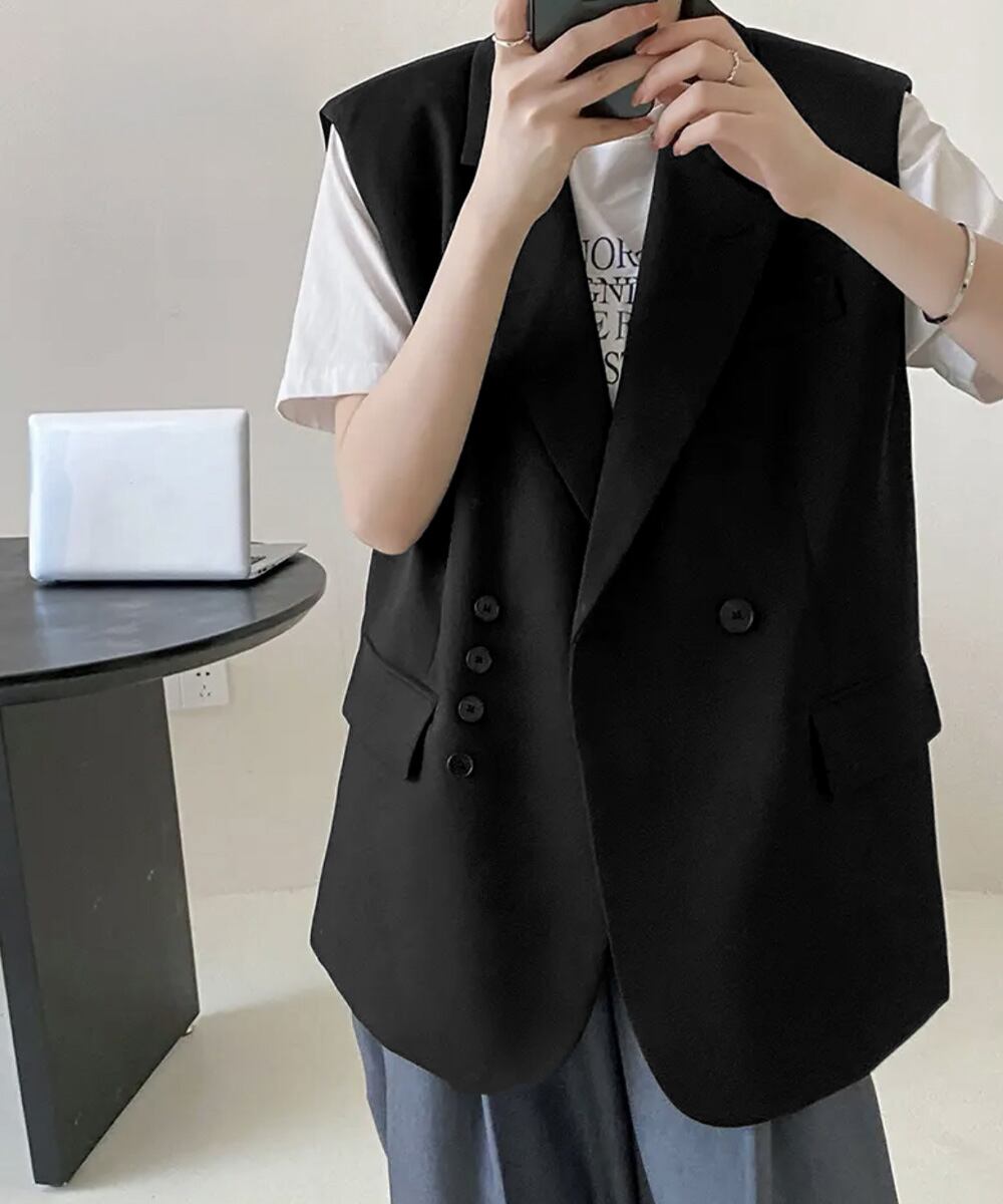 テーラードジレ ダブルボタン ノースリーブジャケット 体型カバーベスト着やせ オフィスカジュアル 春夏秋冬ライトアウター