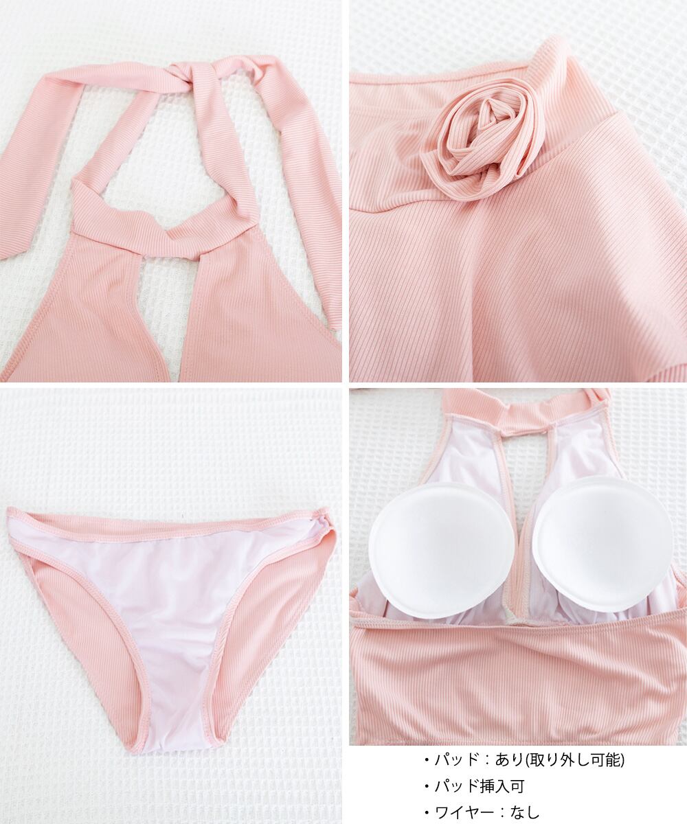 胸元のキーホールデザインと立体的なフラワーアクセントが、上品で女性らしい印象を演出。
