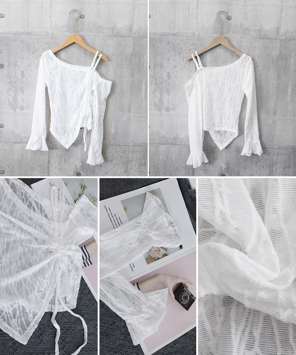 アシンメトリードロストトップス フレア袖カットソー シャーリングリボン タイトTシャツ シースルーレーストップスセクシー