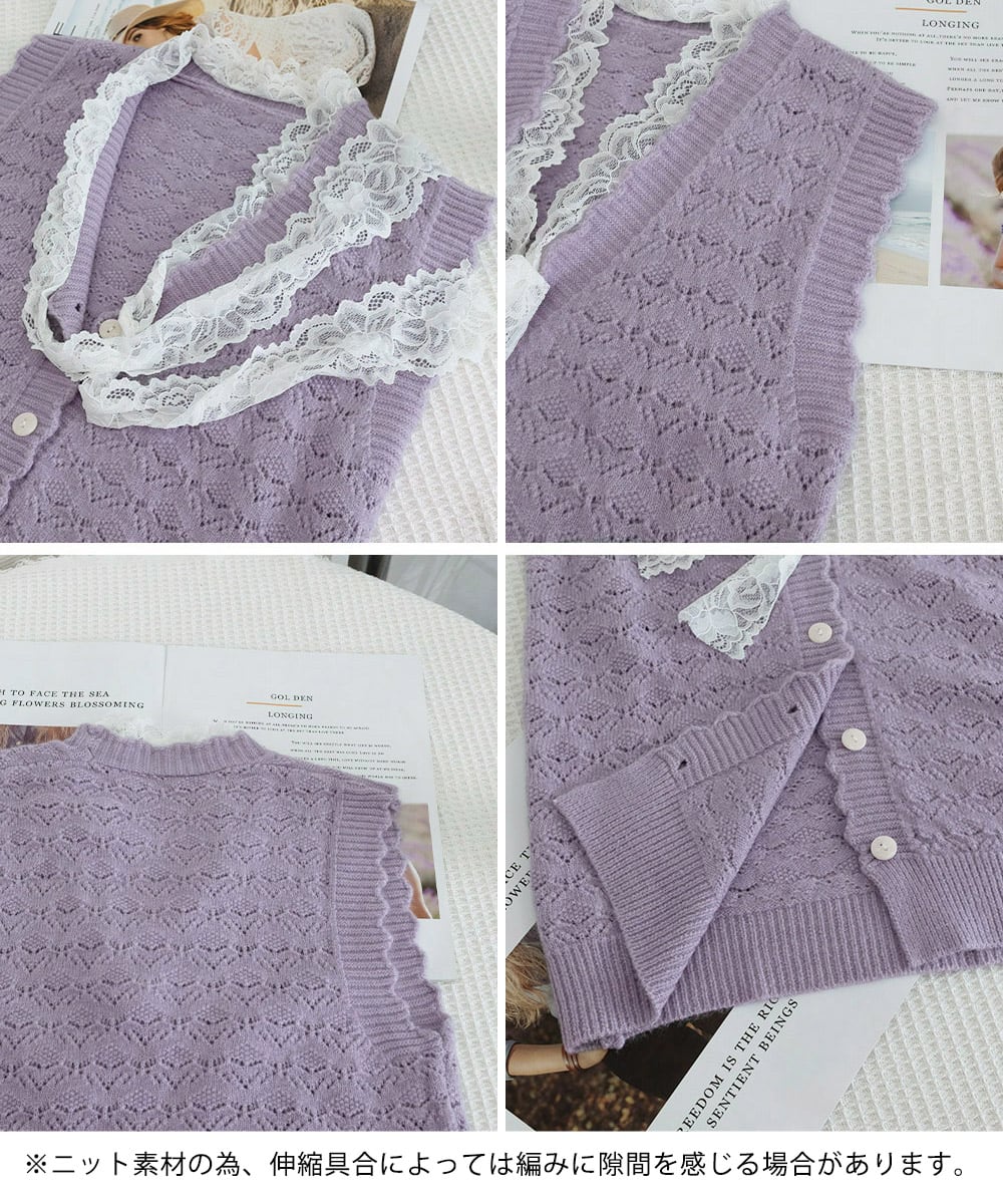 ネックラインにレースをあしらい、リボンがポイントになったニットベスト。