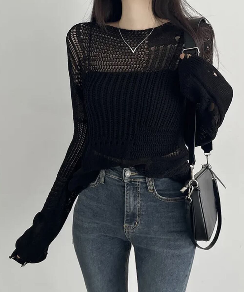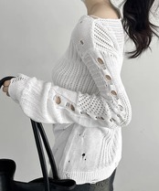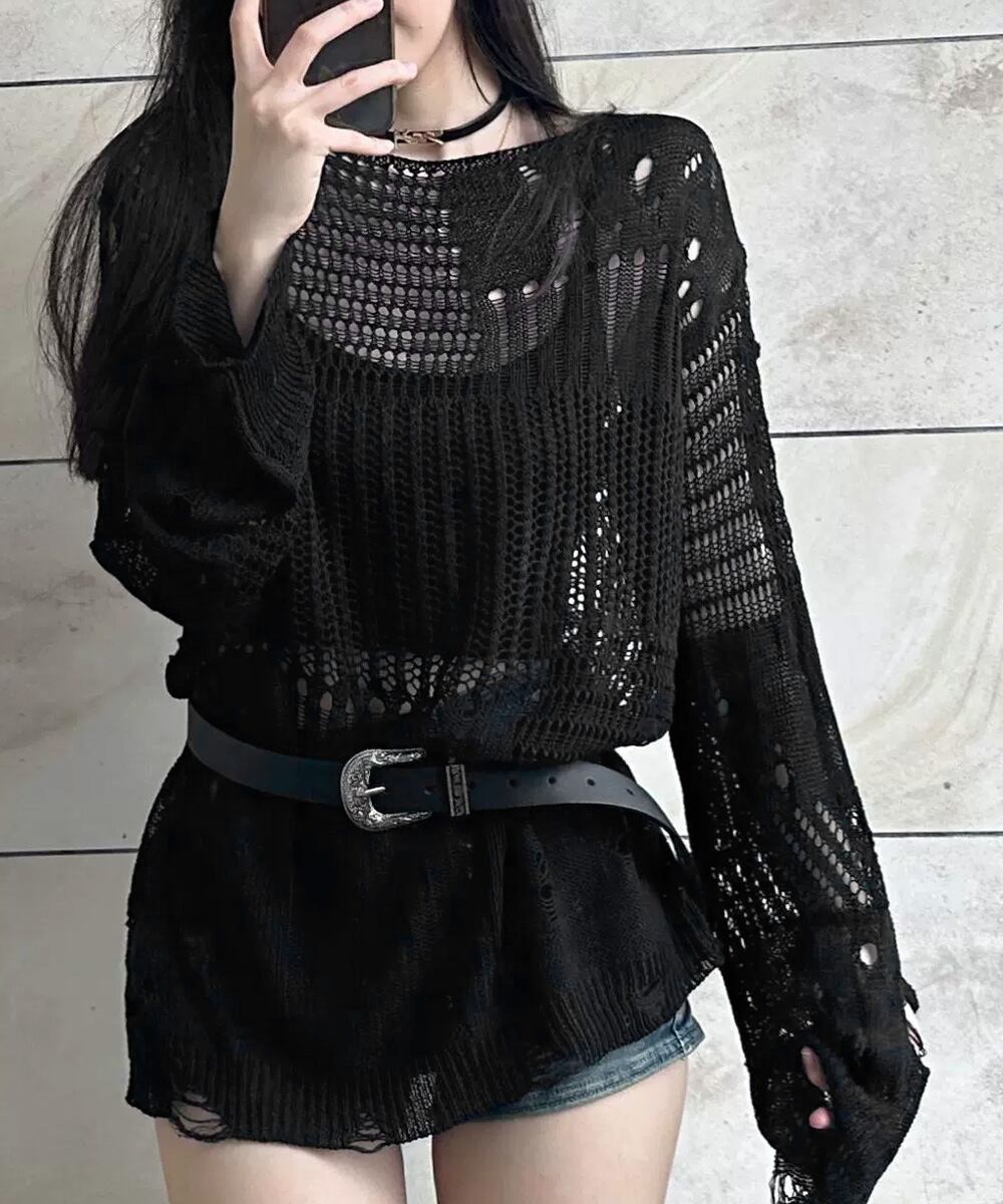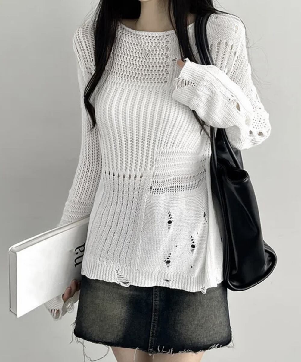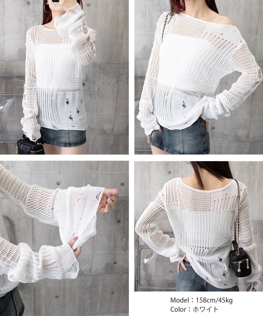 ダメージ加工と透かし編みが施された、トレンド感満載のニットトップス。