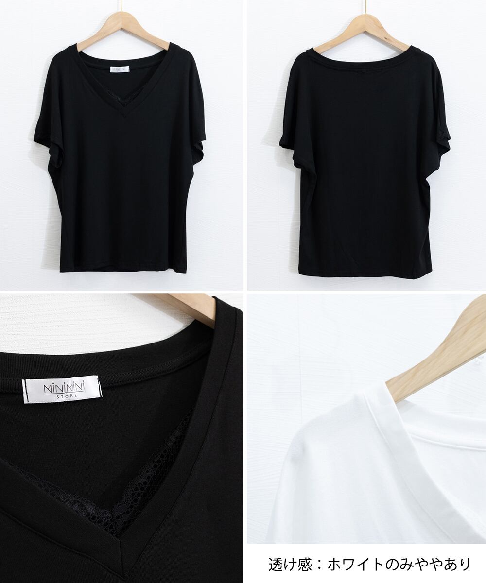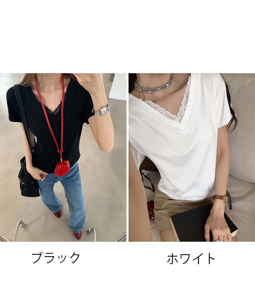 顔まわりをすっきり見せるVネック×レースデザインで、モテ服としても人気の高いアイテム。
