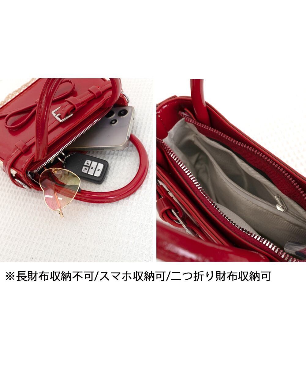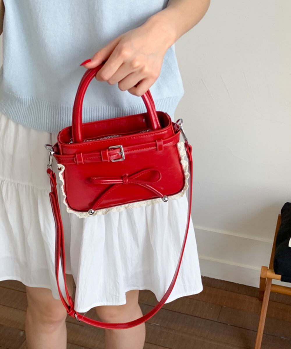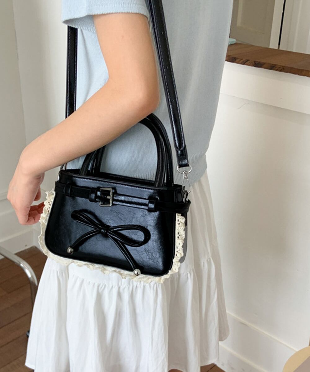 フロントのリボンと縁にあしらわれたレースが目を惹く、フェイクレザー素材の2WAYミニバッグ。