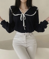 フレンチムード漂うリボンタイ付きのビッグカラーブラウス。