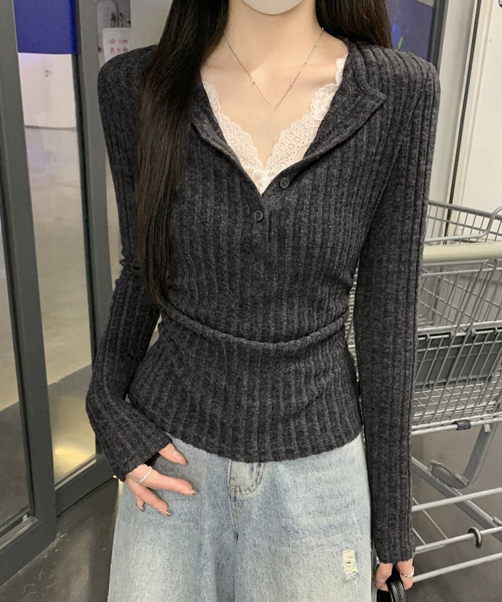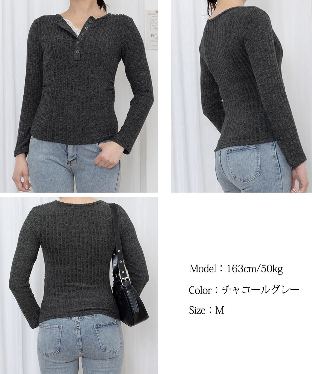 首元はVネックで、レースの切り替えがさりげないアクセントに。