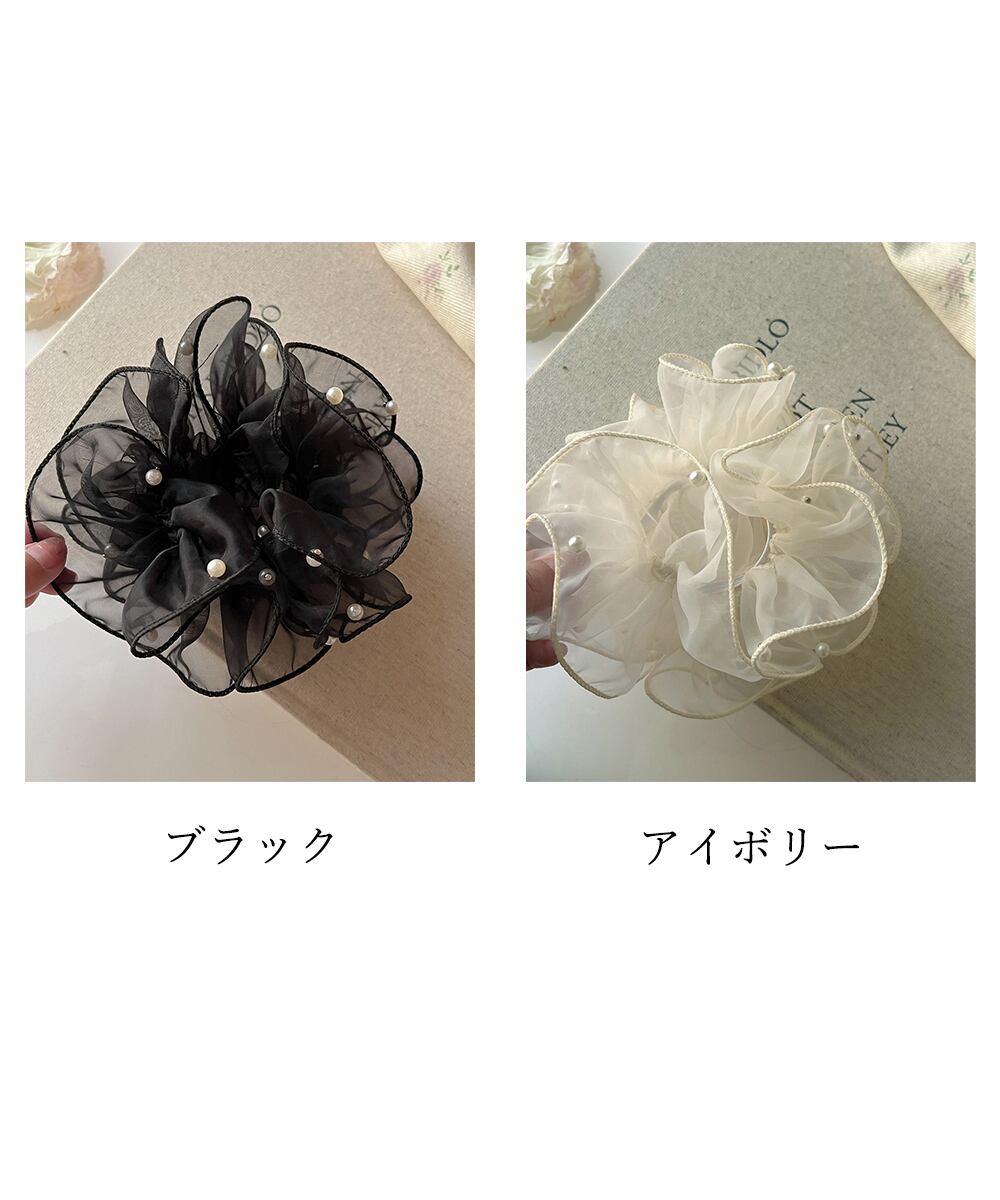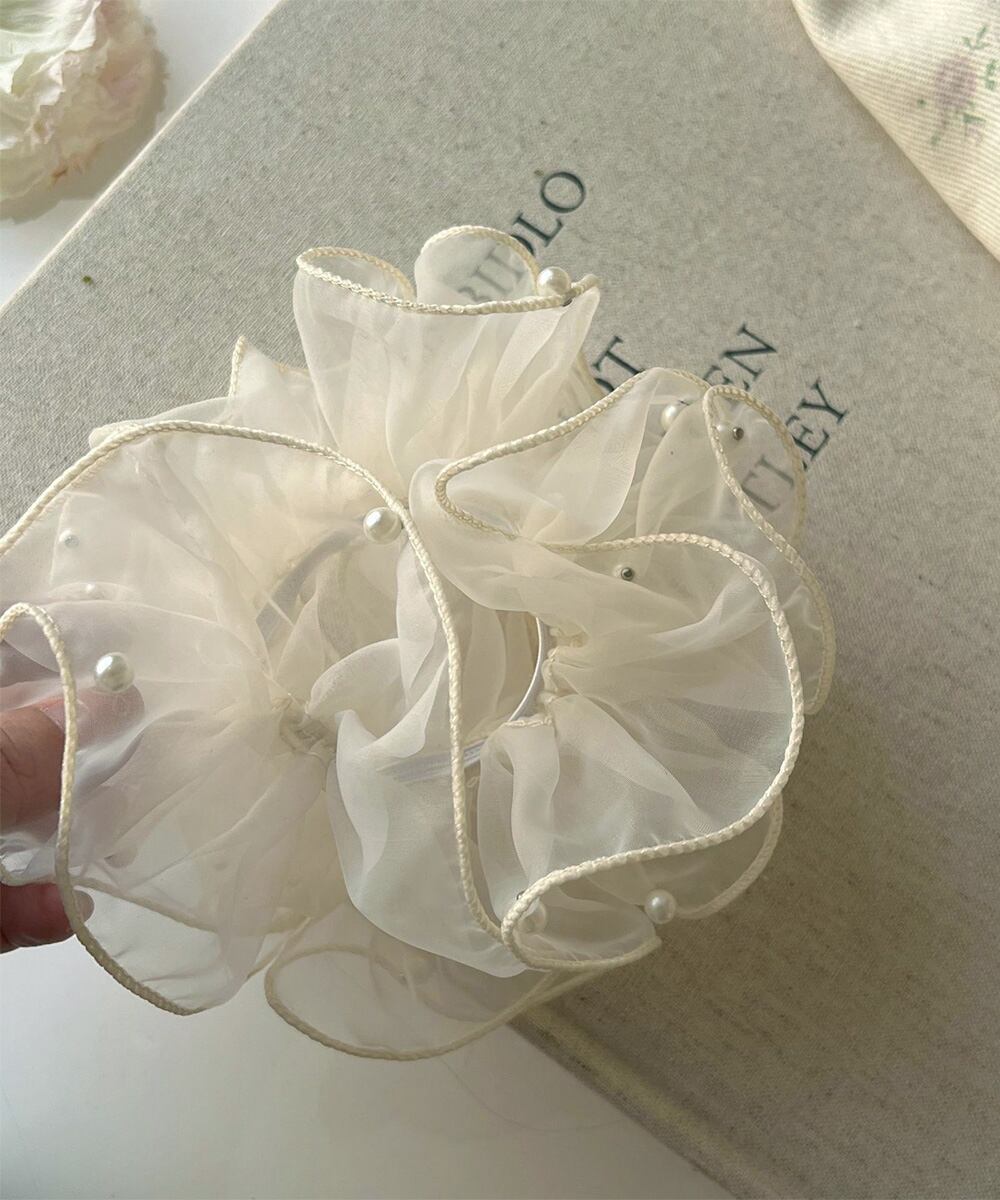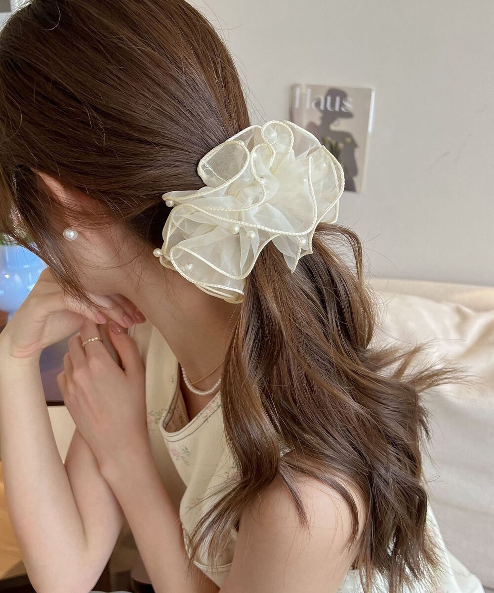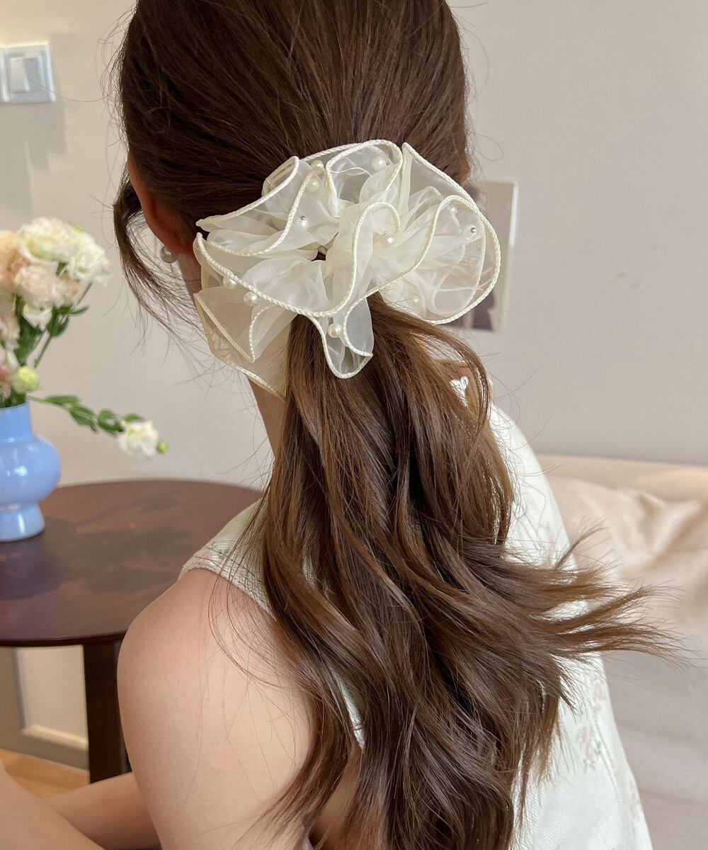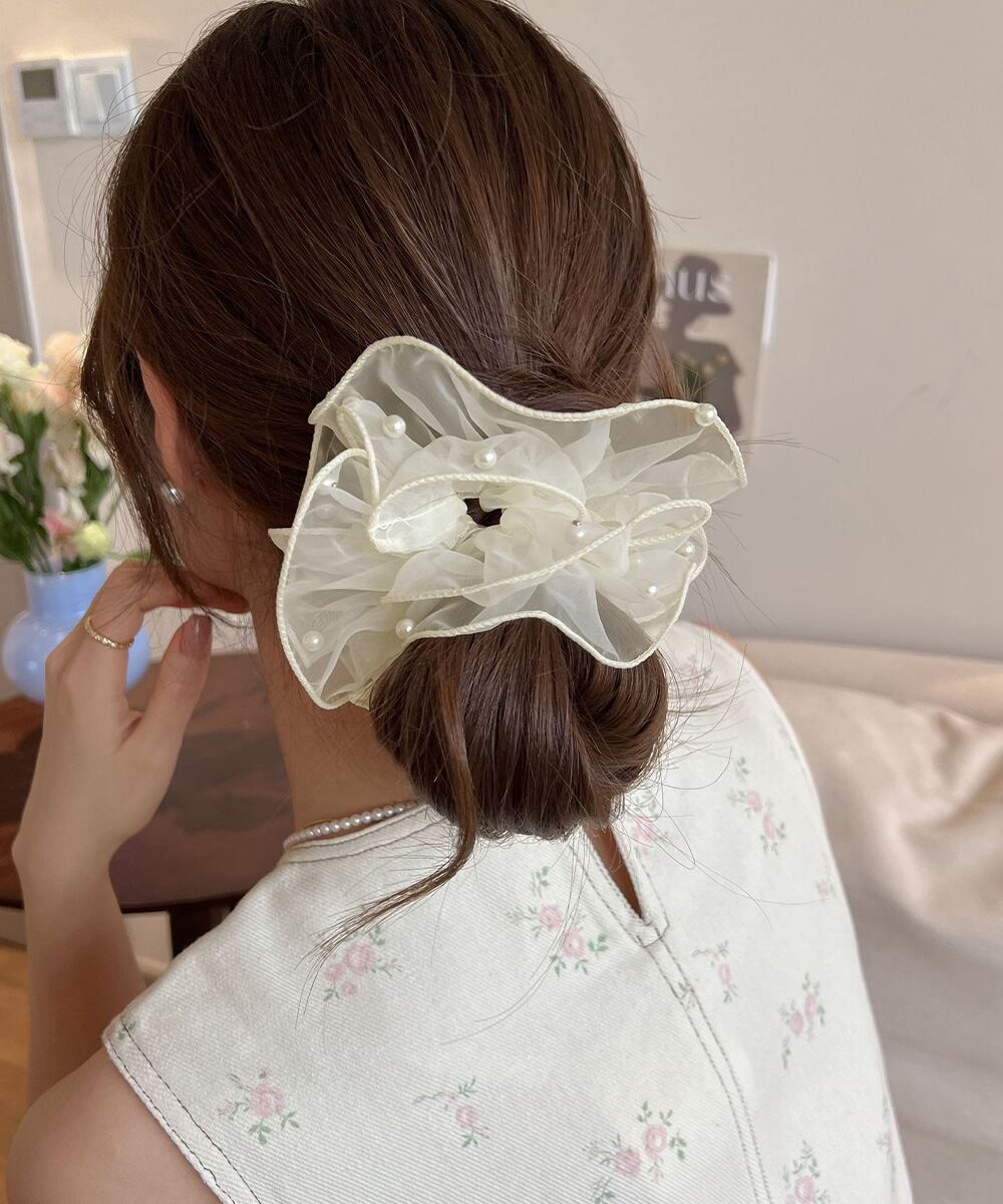 小粒パールを散りばめた、ふんわり透け感のあるオーガンジー素材の上品なシュシュ。