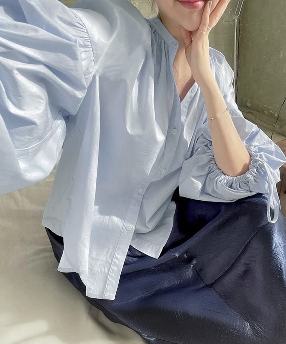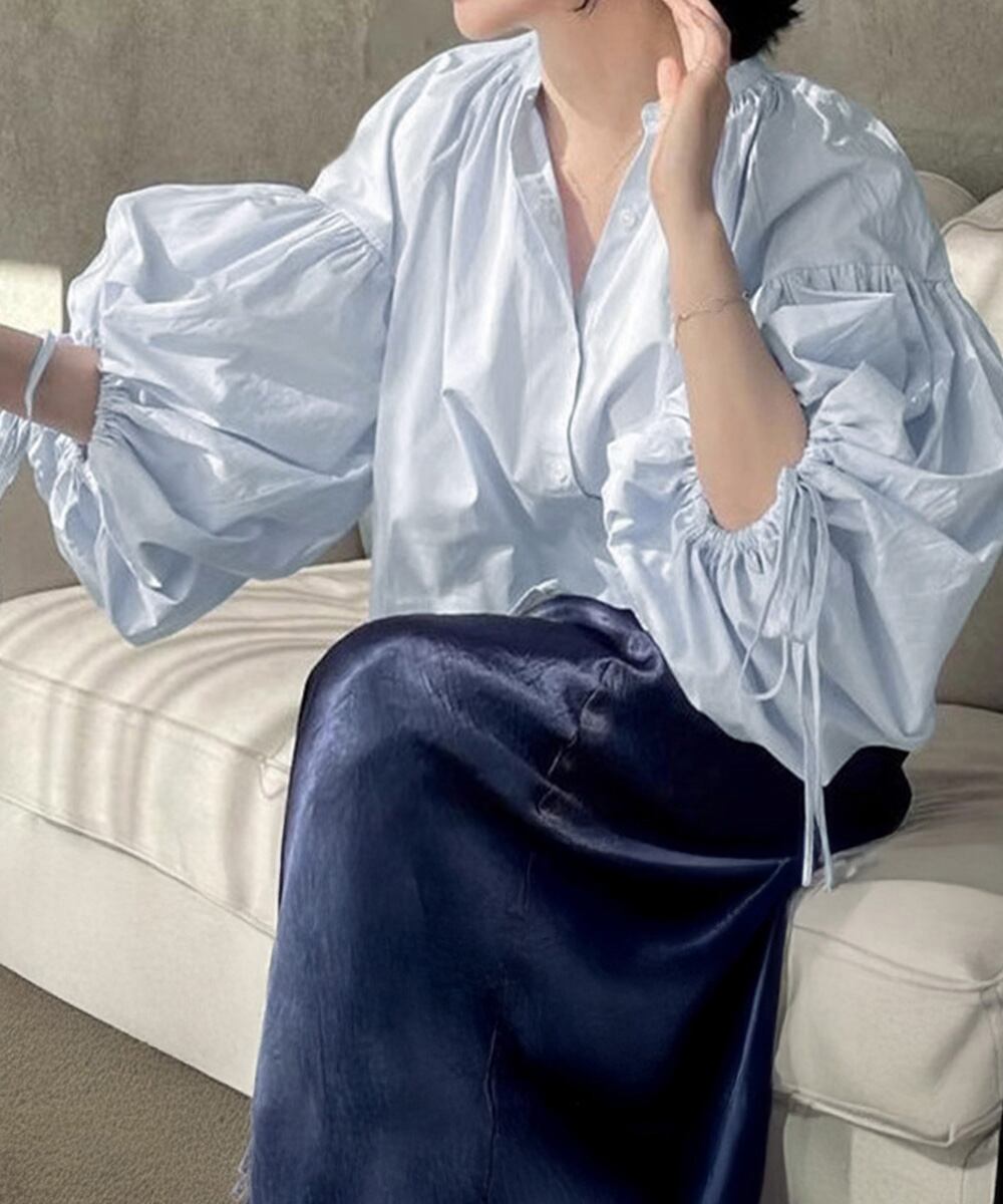たっぷりギャザーを寄せたボリューム袖が印象的なラウンドネックシャツ。