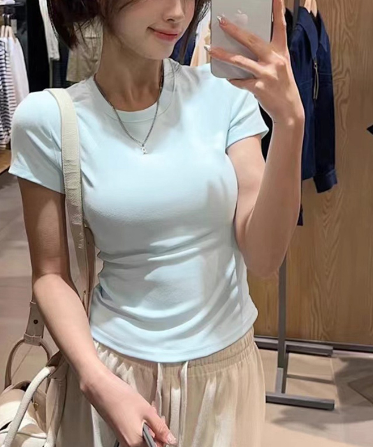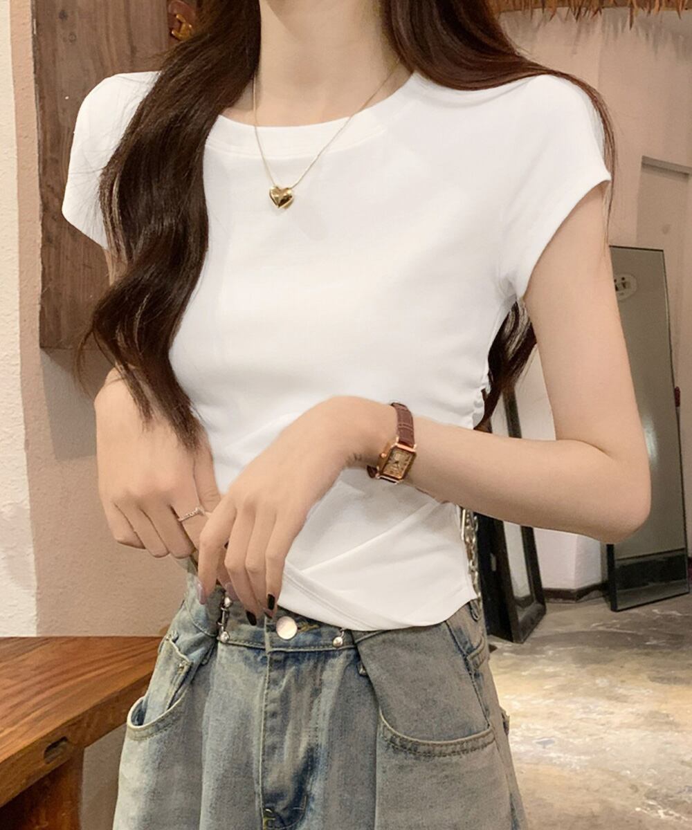ラウンドネックちびTシャツ レディース 無地タイトtシャツ 韓国風シンプル 着やせ細見えTシャツ サイドタックカットソー