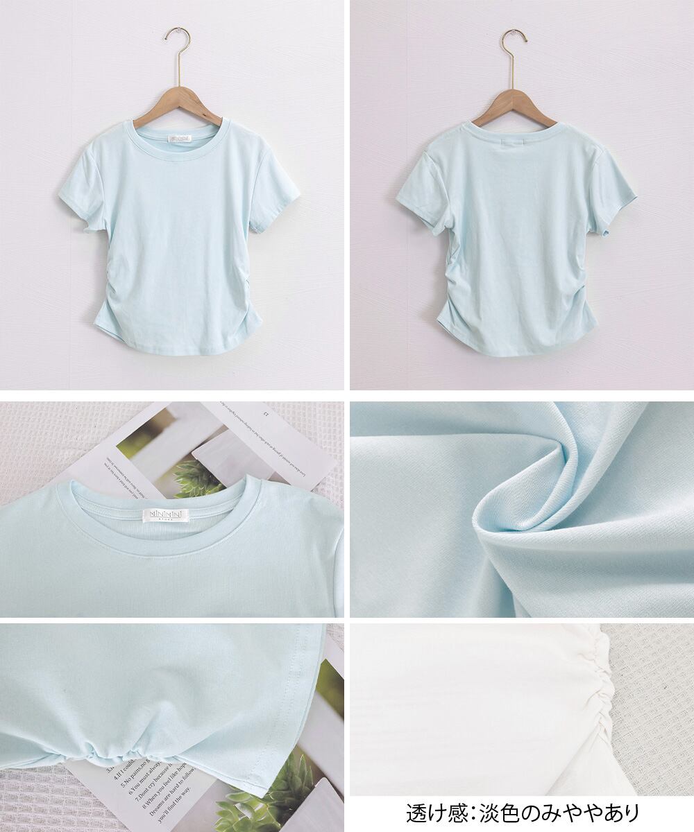 サイドギャザーデザインが女性らしいシルエットを演出する半袖Tシャツ。