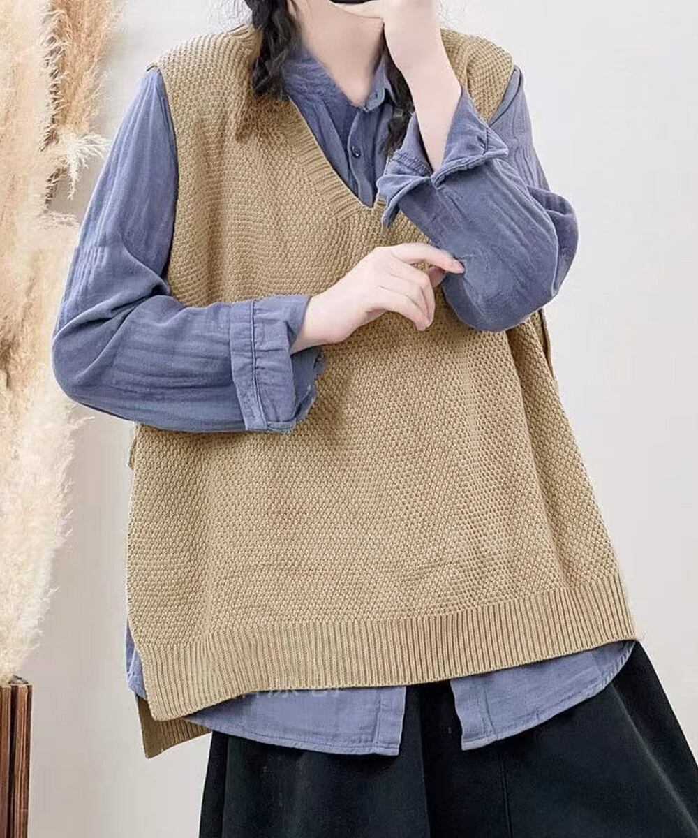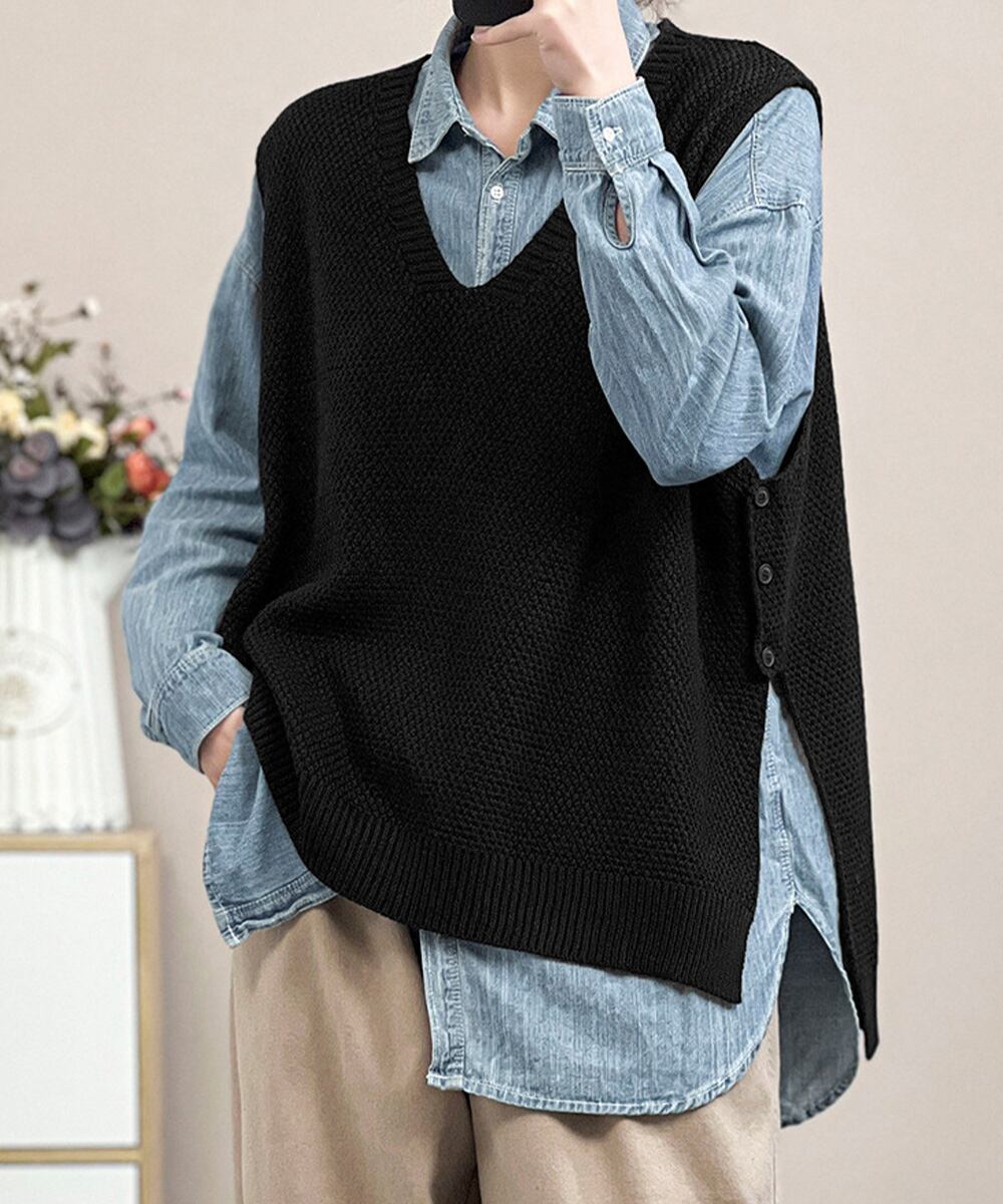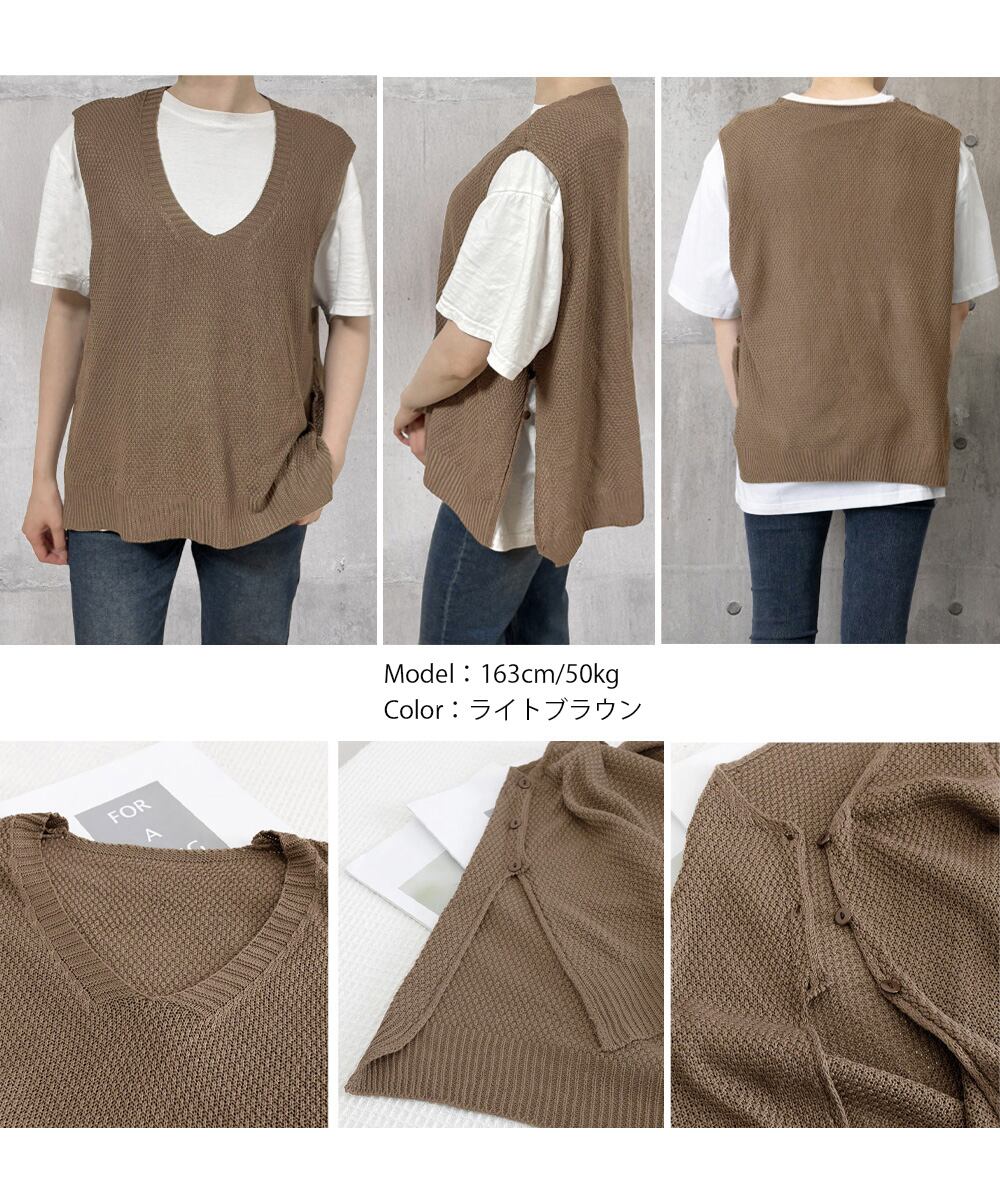 レディース サイドボタン Vネックチョッキ 重ね着 ゆったり プルオーバー レイヤードベスト 体型カバー ニットトップス