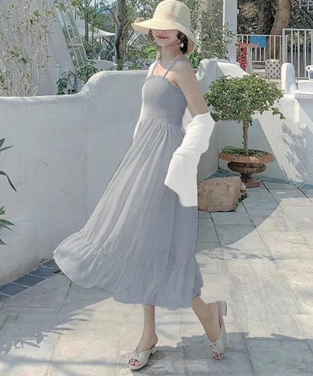 リゾート感たっぷりのキャミワンピースとシアーニットカーディガンのセットアップ。