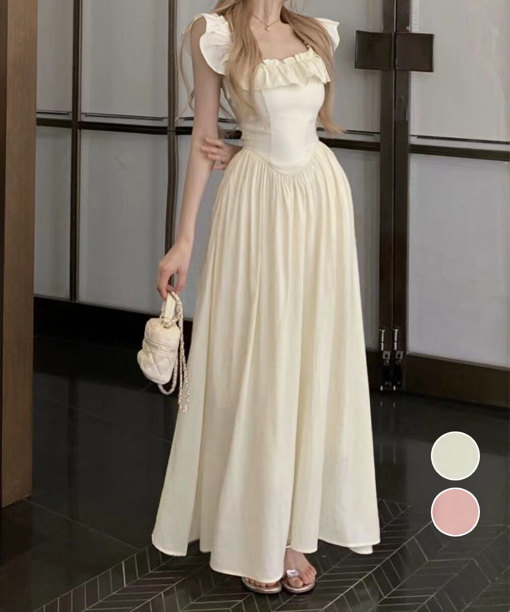 フェミニンな雰囲気が漂う、フリル付きロング丈ワンピース。