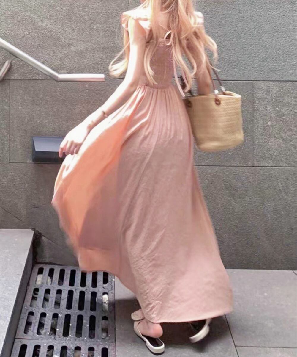レディース スクエアネックリゾートワンピース ハイウエストフレアワンピース バックシャーリング 春夏ロングワンピ 韓国風