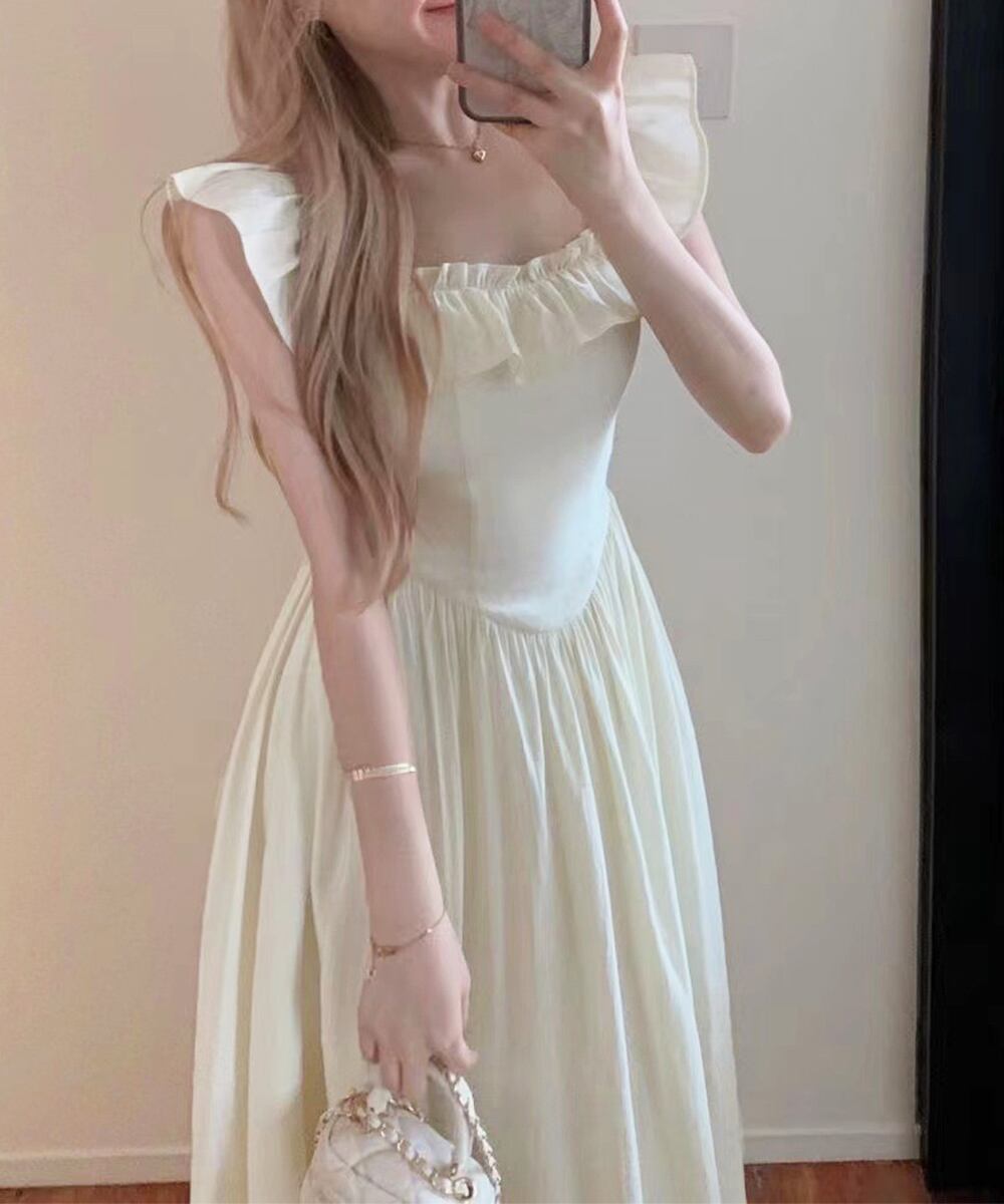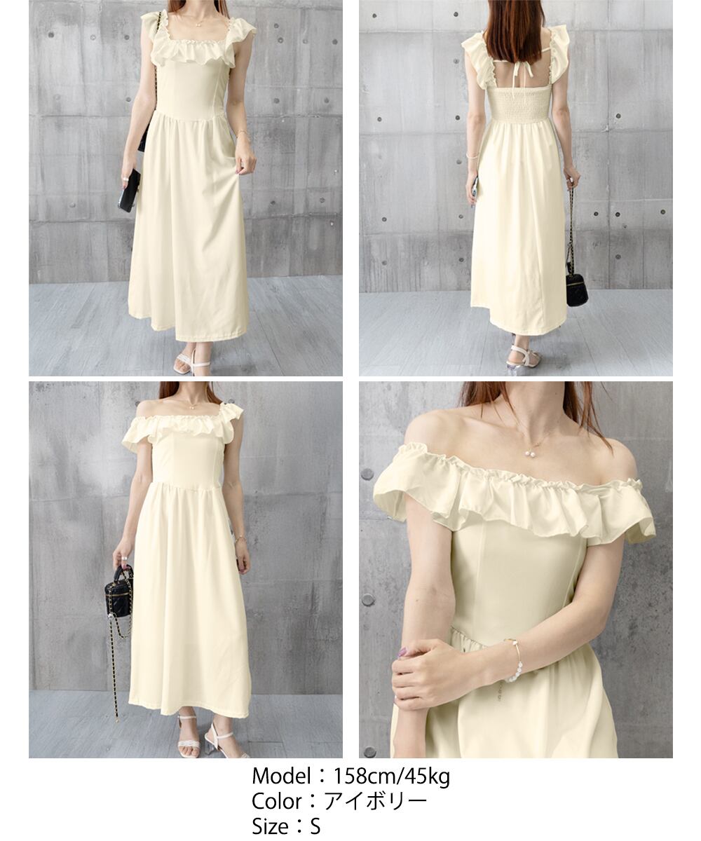 スクエアネックと肩のフリルデザインがクラシカルで上品な印象をプラス。